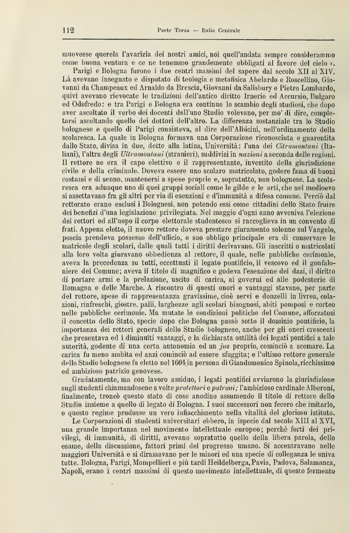 Parigi e Bologna furono t due centri massimi del sapere dal secolo XII al XIV. Là «avevano insegnato e disputato di teologia e metafisica Abelardo e Roscellino, Giovanni da Champeaux ed Arnaldo da Brescia, Giovanni da Salisbury e Pietro Lombardo, quivi avevano rievocate le tradizioni dell'antico diritto Irnerio ed Accursio, Bulgaro ed Odofredo : e tra Parigi e Bologna era continuo lo scambio degli studiosi, clie dopo aver ascoltato il verbo dei docenti dell'uno Studio volevano, per ino' di dire, completarsi ascoltando quello dei dottori dell'altro. La differenza sostanziale tra lo Studio bolognese e quello di Parigi consisteva, al dire dell'Allucini, nell'ordinamento della scolaresca. La quale iti Bologna formava una Corporazione riconosciuta e guarentita dallo Stato, divisa in due, dette alla latina, Università: l'una dei Citrauionlani (Italiani), l'altra degli Ultramontani (stranieri), suddivisi in nazioni a seconda delle regioni. Il rettore ne era il capo elettivo e il rappresentante, investito della giurisdizione civile e della criminale. Doveva essere uno scolaro matricolato, godere fama di buoni costumi e di senno, mantenersi a spese proprie e, sopratutto, non bolognese. La scolaresca era adunque uno di quei gruppi sociali come le gilde e le arti, che nel medioevo si assettavano fra gli altri per via di esenzioni e d'immunità a difesa comune. Perciò dal rettorato erano esclusi i Bolognesi, non potendo essi come cittadini dello Stato fruire dei benefizi d'una legislazione privilegiata. Nel maggio d'ogni anno avveniva l'elezione dei rettori ed all'uopo il corpo elettorale studentesco si raccoglieva in un convento di frati. Appena eletto, il nuovo rettore doveva prestare giuramento solenne sul Vangelo, poscia prendeva possesso dell'ufficio, e suo obbligo principale era di conservare le matricole degli scolari, dalle quali tutti i diritti derivavano. Gli inscritti o matricolati alla loro volta giuravano obbedienza al rettore, il quale, nelle pubbliche cerimonie, aveva la precedenza su tutti, eccettuati il legato pontificio, il vescovo ed il gonfaloniere del Comune; aveva il titolo di magnifico e godeva l'esenzione dei dazi, il diritto di portare armi e la prelazione, uscito di carica, ai governi ed alle podesterie di Romagna e delle Marche. A riscontro di questi onori e vantaggi stavano, per parte del rettore, spese di rappresentanza gravissime, cioè servi e donzelli in livrea, colazioni, rinfreschi, giostre, palii. larghezze agli scolari bisognosi, abiti pomposi e corteo nelle pubbliche cerimonie. Ma mutate le condizioni politiche del Comune, afforzatosi il concetto dello Stato, specie dopo che Bologna passò sotto il dominio pontificio, la importanza dei rettori generali dello Studio bolognese, anche per gli oneri crescenti che presentava ed i diminuiti vantaggi, e la dichiarata ostilità dei legati pontifici a tale autorità, godente di una corta autonomia ed un jus proprio, cominciò a scemare. La carica fu meno ambita ed anzi cominciò ad essere sfuggita; e l'ultimo rettore generale dello Studio bolognese fu eletto nel IGOlin persona di Giandomenico Spinola,ricchissimo od ambizioso patrizio genovese.