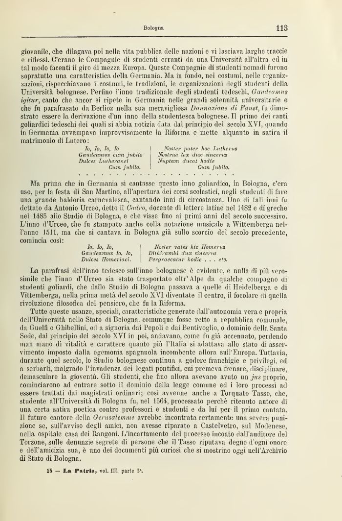 giovanile, che dilagava poi nella vita pubblica delle nazioni e vi lasciava larghe traccio e ritiessi. C'erano le Compagnie di studenti erranti da una Università all'altra ed in tal modo facenti il giro di mezza Europa. Queste Compagnie di studenti nomadi furono sopratutto una caratteristica della Germania. Ma in fondo, nei costumi, nelle organizzazioni, rispecchiavano i costumi, le tradizioni, le organizzazioni degli studenti della Università bolognese. Perfino l'inno tradizionale degli studenti tedeschi, Gaudeamus iijitur, canto che ancor si ripete in Germania nelle grandi solennità universitarie e che fu parafrasato da Berlioz nella sua meravigliosa Dannazione di Faust, fu dimostrato essere la derivazione d'un inno della studentesca bolognese. Il primo dei canti goliardici tedeschi dei quali si abbia notizia data dal principio del secolo XVI, quando in Germania avvampava improvvisamente la Riforma e mette alquanto in satira il matrimonio di Lutero :