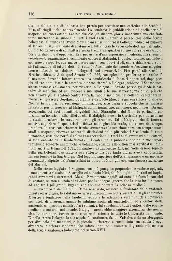 tissimo della sua città la lasciò ben presto per accettare una cattedra allo Studio di Pisa, offertagli molto onorevolmente. Là cominciò la pubblicazione di quella serie di scoperte ed osservazioni anatomiche che gli diedero gloria imperitura, ma che frattanto mettevano in subbuglio tutti i suoi antichi emuli e persecutori dello Studio bolognese, al punto che Ovidio Montalbani riuscì indurre il Collegio medico ad imporre ai laureandi il giuramento di sostenere a tutta possa le venerande dottrine dell'antico Studio bolognese e di combattere senza tregua ne quartiere i novatori che osavano di porle in dubbio o d'opporvisì. Era, per usare d'una espressione moderna, una specie di boicottaggio, organizzato specialmente contro il Malpighi. 11 quale, peralt'-o, rispondeva con nuove scoperte, con nuove osservazioni, con nuovi studi, che richiamavano su dì se l'attenzione di tutti i dotti, di tutte le Accademie del mondo e facevano maggiormente imbestialire i dottoroni bolognesi suoi avversari. I)a Pisa passò allo Studio d Messina, chiamatovi da quel Senato nel 16G2, con splendide profferte; ma anche là il novatore, dovendo lottare contro una combriccola dì fanatici oppositori, dopo poco più di tre anni, lasciò la cattedra e se ne ritornò a Bologna, sebbene il Senato messinese instasse caldamente per riaverlo. A Bologna il Senato patrio gli diede la cattedra di medicina ed egli riprese i suoi studi e le sue scoperte; ma quivi, più che non altrove, gli si scatenò contro tutta la rabbia invidiosa dei colleghi, capitanati dal medico e professore Gerolamo Sbaraglia e da Paolo Mini, che già era stato suo allievo. Non vi fu ingiuria, persecuzione, diffamazione, arte bassa e subdola che si lasciasse intentata pur di nuocere al Malpighi nella riputazione, nell'onore, negli averi. Da una accozzaglia dei suoi detrattori, guidati dallo Sbaraglia e dal Mini, lu portino organizzata un'invasione alla villetta che il Malpighi aveva in Corticella per devastarne