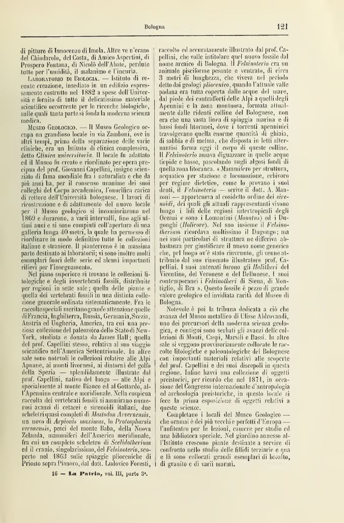 Nel piano superiore si trovano le collezioni litologiche e degli invertehrati fossili, distribuite per regioni in sette sale; quella delle piante e quella dei vertebrati fossili in una distinta collezione generale ordinata sistematicamente. Fra le raccoltespeciali mcritanograndeattenzione quelle diFrancia, Inghilterra, Russia, Germania,Svezia, Austria ed Ungheria, America, tra cui una preziosa collezione del paleozoico dello Stato di New-York, studiata è donata da James Hall ; quella del prof. Capellini stesso, relativa al suo viaggio scientilico nell'America Settentrionale. In altre sale sono notevoli le collezioni relative alle Alpi Apuane, ai monti livornesi, ai dintorni del golfo della Spezia — splendidamente illustrate dal prof. Capellini, nativo del luogo — alle Alpi e specialmente al monte Bianco ed al Gottardo, al-I Apennino centrale e meridionale. Nella cospicua raccolta dei vertebrati fossdi si ammirano numerosi avanzi di cetacei e sirenoidi italiani, due scheletri quasi completi di Mastodon Arvernensis, un uovo di Arpionili maxi mas, lo l'rolospharsis veronensis, pesci del monte Baba, della Nuova Zelanda, mammiferi dell'America meridionale, fra cui un completo scheletro di Scelitlollierium ed il cranio, singolarissimo, del Feìsinolerio, scoperto nel 1803 sulle spiaggic plioceniche di Priosto sopra Pianoro, dal dutt. Ludovico Foresti,