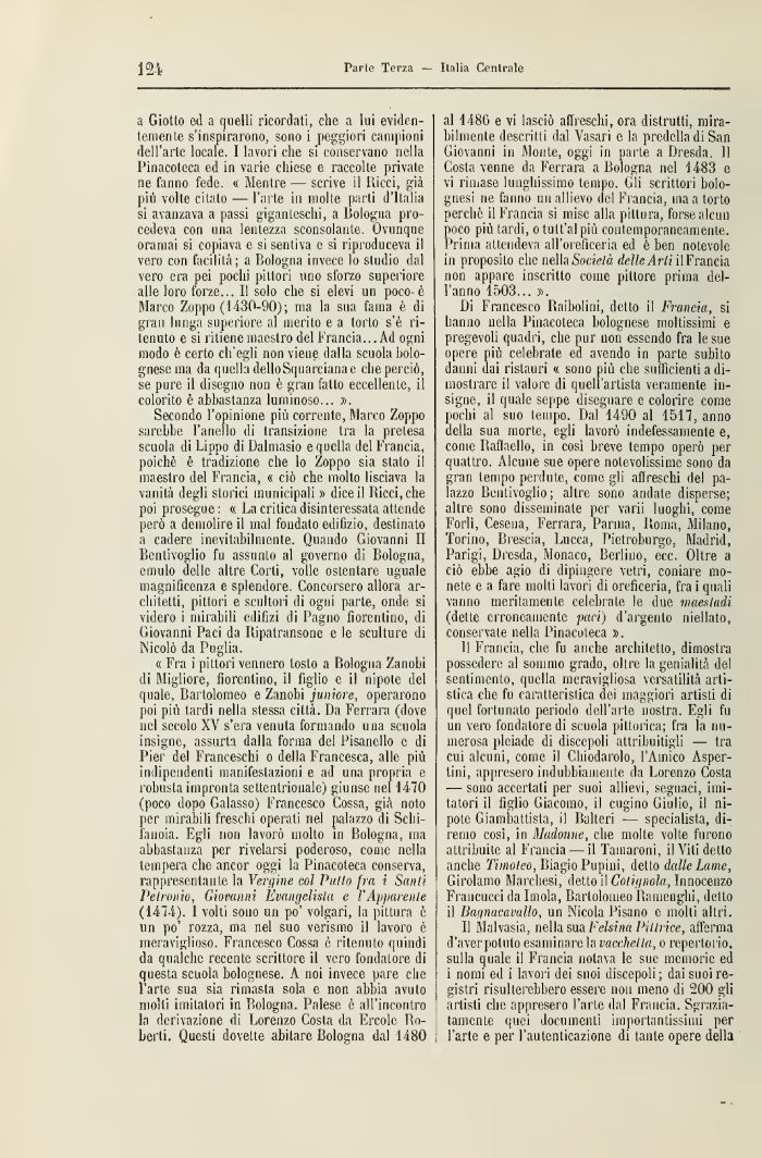 « Fra i pittori vennero tosto a Bologna Zanobi di Migliore, fiorentino, il figlio e i! nipote del quale, Bartolomeo e Zanobi juniore, operarono poi più tardi nella stessa città. Da Ferrara (dove nel secolo XV s'era venuta formando una scuola insigne, assurta dalla forma del Pisanello e di Pier del Franceschi o della Francesca, alle più indipendenti manifestazioni e ad una propria e robusta impronta settentrionale) giunse nel 1470 (poco dopo Galasso) Francesco Cossa, già noto per mirabili freschi operati nel palazzo di Sclii-fanoia. Egli non lavorò molto in Bologna, ma abbastanza per rivelarsi poderoso, come nella tempera che ancor oggi la Pinacoteca conserva, rappresentante la Verdine col Palio fra i Sanli PelmnÌQ, Giovanni llvangelisla e l'Apìiarenle (14-74). I volti sono un po' volgari, la pittura è un po' rozza, ma nel suo verismo il lavoro è meraviglioso. Francesco Cossa è ritenuto quindi da qualche recente scrittore il vero fondatore di questa scuola bolognese. A noi invece pare clic l'arte sua sia rimasta sola e non abbia avuto molli imitatori in Bologna. Palese é all'incontro la derivazione di Lorenzo Costa da Ercole Roberti. Questi dovette abitare Bologna dal 1480
