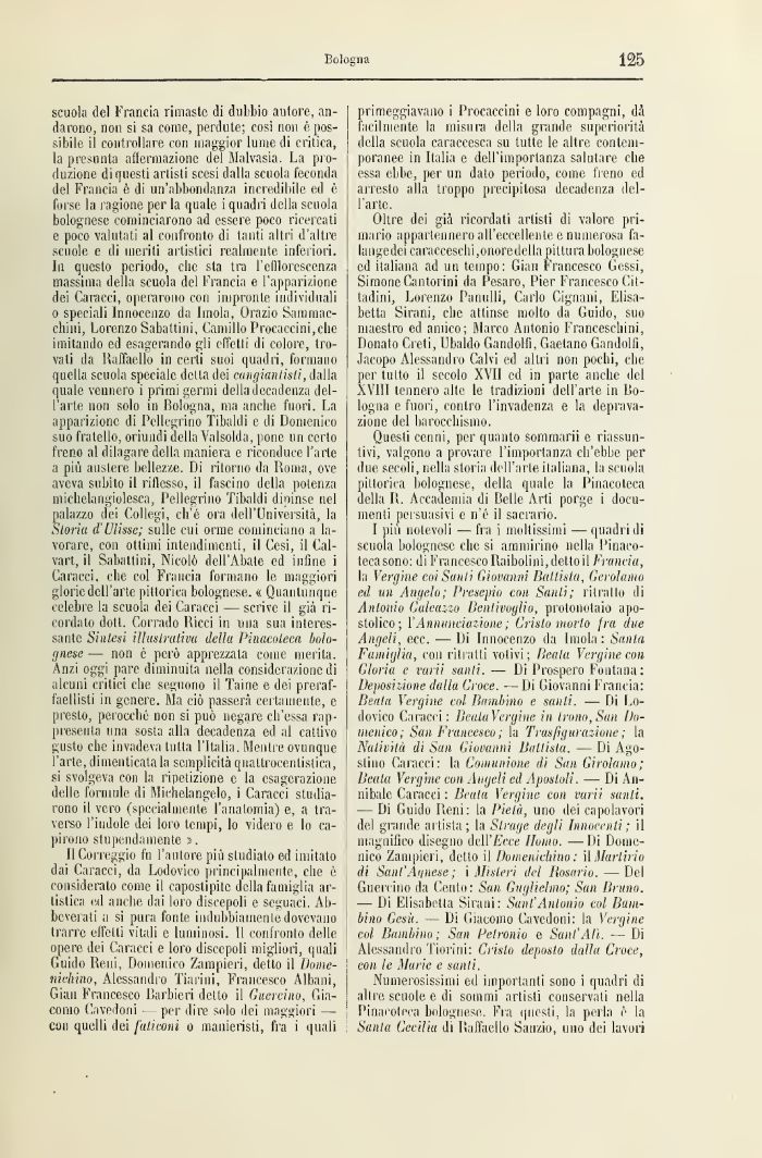 I più notevoli —fra i moltissimi —quadri di scuola bolognese che si ammirino nella Pinacoteca sono: ili Francesco Ilaibolini, detto il Francia, la Vergine coi Santi Giovanni Ballista, Gerolamo ed un Angelo; Presepio con Salili; ritratto ili Antonio Galeazzo Dentivoglio, protonotaio apostolico; YAnnunciazione ; Cristo inolio fra due Angeli, ecc. — Di Innocenzo da Imola: Santa Famiglia, con ritiatli votivi; Beala Vergine con Giuria e varii santi. — Di Prospero Fontana : Deposizione dalla Croce. --Di Giovanni Francia: Beata Vergine col Bambino e santi. — Di Lodovico Caracci : BeataVergiue in trono,San Domenico ; San Francesco ; la Trasfigurazione; la Natività di San Giovanni Battista. — Di Agostino Caracci la Comunione di Sun Girolamo; Beala Vergine con Angeli ed Apostoli. — Di Annibale Caracci : Beala Vergine con varii santi.