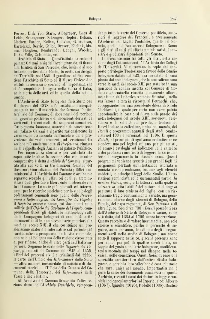 Interessantissimo fra tutti gli altri, nella sezione degli Enti autonomi, è l'Archivio dei Collegi dell'Università. Vi si trovano le copie del supposto privilegio Teodosiano a favore dello Studio bolognese datato dal 423, ma inventato di sana pianta dai notai bolognesi, clic lo controiirmarouo verso la metà del secolo XIII per statuire in una quistione di confini insorta col Comune di Modena: gherminella riuscita pienamente allora, nm sfatata da Ludovico Antonio Muratori, nella sua famosa lettera in risposta al Petrocchi, che, appoggiandosi su una precedente difesa di Nicolò Machiavelli, il quale per certo non aveva potuto approfondire la cosa e si fidava sulle parole dei notai bolognesi del secolo XIII, sosteneva l'esistenza e la validità del privilegio teodosiano. Ravvi inoltre la collezione, unica nel mondo, dei Rottili 0 programmi annuali degli studi cominciati nel 1384 e terminati nel 1796. Di questi Rotali, al principiu di ogni anno scolastico se ne stendeva uno pei legisti ed uno per gli artisti, ed erano i cataloghi od indicatori delle cattedre e dei professori incaricati di leggere le varie materie d'insegnamento in ciascun anno. Questi programmi venivano trascritti su grandi fogli di pergamena portanti 111:'intestazione istoriata e miniata e comprendevano, insieme agli elenchi suddetti, le principali leggi dello Studio. L'intestazione cominciava colle sacramentali parole: la nomine Patris, ecc., e la lettera/, sulla quale si sbizzarriva tutta l'abilità del pittore, si allungava per tuttu il lato sinistro del foglio, con un ricchissimo fregio continuamente variato, ma generalmente adorno degli stemmi ili Bologna, dello Studio, del papa regnante, ili San Petronio e di altre figure. S011 circa 700 i Rotulì posseduti ura dall'Archivio di Stato di Bologna e vanno, come si è detto, dal 1084 al 1790, senza interruzione. Questa raccolta è di valore inestimabile, non solo storico e scientifico, poiché ci permette di seguire, anno per anno, lo sviluppo degli insegnamenti varii nello studio di Bologna ; ma anche sotto il rapporto artistico, giacché presenta anno per anno, per più ili quattro secoli filati, un saggio del gusto e dell'arte bolognese, niodilìcan-tesi a seconda dei tempi nel disegno, nella tecnica, nelle concezioni. Questi Rottili furono una specialità caratteristica dell'antico Studio bolognese, e perciò la loro collezione è cosa, piuttosto che rara,, unica nel mondo. Importantissima è pure la serie dei documenti conservati in questo ] Archivio, recanti i nomi dei dottori ili legge e cau-; sidiei bolognesi anteriori ad Irnerio, cioè: Alberto i (1067), Iginulfo (1076), Rodolfo (1086), Bustico