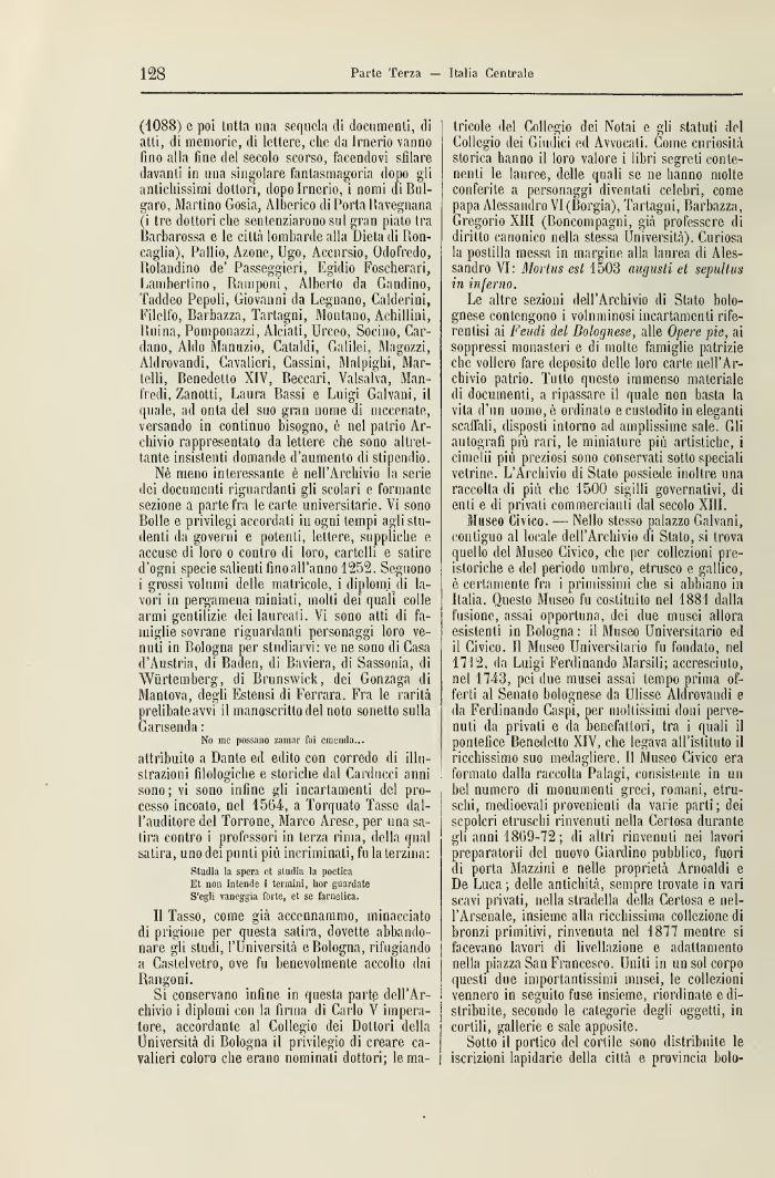 attribuito a Dante ed edito con corredo di illustrazioni filologiche e storiche dal Carducci anni sono ; vi sono infine gli incartamenti del processo incoato, nel 1564, a Torquato Tasso dall'auditore del Torrone, Marco Arese, per una satira contro i professori in terza riunì, della qnal satira, uno dei punti più incriminali, fn la terzina: