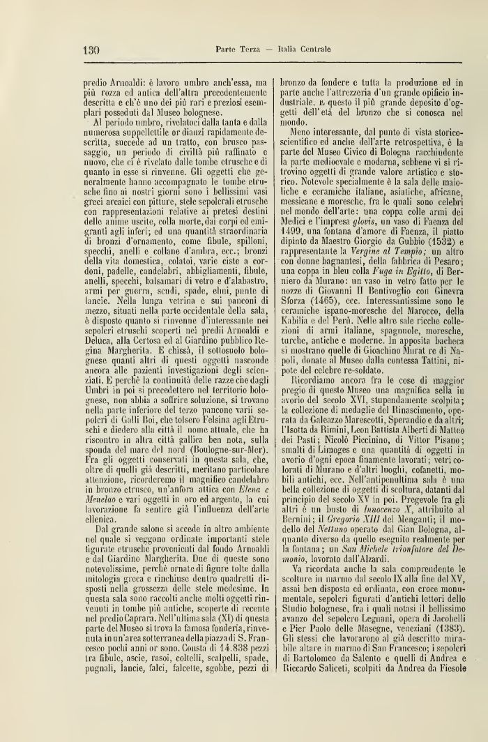 ÀI periodo umbro, rivelatoci dalla tanta e dalla numerosa suppellettile or dianzi rapidamente descritta, succede ad un tratto, con brusco passaggio, uri periodo di civiltà più raflinato e nuovo, che ci è rivelato dalle tombe etruscbe e di quanto in esse si rinvenne. Gli oggetti che generalmente hanno accompagnato le tombe etnische fino ai nostri giorni sono i bellissimi vasi greci arcaici con pitture, stele sepolcrali etnische con rappresentazioni relative ai pretesi destini delle anime uscite, colla morte,dai corpi ed emigranti agli inferi ed una quantità straordinaria i bronzi d'ornamento, come fibule, spilloni, specchi, anelli e collane d'ambra, ecc.; bronzi della vita domestica,, colatoi, varie ciste a cordoni, padelle, candelabri, abbigliamenti, fibule, anelli, specchi, balsamari di vetro e d'alabastro, armi per guerra, scudi, spade, elmi, punte di lancio. Nella lunga vetrina e sui panconi di mezzo, situati nella parte occidentale della sala, è disposto quanto si rinvenne d'interessante nei sepolcri etruschi scoperti nei predii Arnoaldi e Delùca, alla Certosa ed al Giardino pubblico Regina Margherita. E chissà, il sottosuolo bolognese quanti altri di questi oggetti nasconde ancora alle pazienti investigazioni degli scienziati. E perchè la continuità delle razze che dagli Umbri in poi si precedettero nel territorio bolognese, non abbia a soffrire soluzione, sì trovano nella parte inferiore del terzo palicene varii sepolcri di Galli lìoi, che tolsero Eelsina agli Etruschi e diedero alla città il nome attuale, che ha riscontro in altra città gallica ben nota, sulla sponda del mare del nord (Boulogne-sur-Mer). Fra gli oggetti conservati in questa sala, che, oltre di quelli già descritti, meritano particolare attenzione, ricorderemo il magnifico candelabro in bronzo etrusco, un'anfora attica con Eletta e Menelao e vari oggetti in oro ed argento, la cui lavorazione fa sentire già l'influenza dell'arte ellenica.