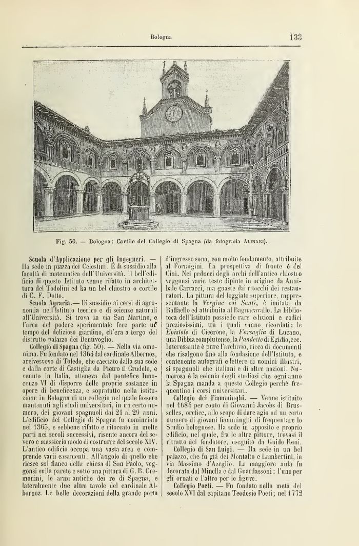 Collegio di Spagna (fig. 50). — Nella via omonima. Fu fondalo nel 4364dal cardinale Albornoz, areivesvovo di Toledo, ehe caeciato dalla sua sede e dalla corte di Castiglia da Pietro il Crudele, e venuto in Italia, otteneva dal pontefice Innocenzo VI di disporre delle proprie sostanze in opere di beneficenza, e sopratutto nella istituzione in P>ologna di un eollegio nel quale fossero manteau ti agli studi universitari, in un certo numero, dei giovani spaglinoli dai 21 ai 29 anni. L'edificio del Collegio di Spagna fu cominciato nel 1365, e sebbene rifatto e ritoceato in molte parti nei secoli successivi, risente ancora del severo e massiccio modo di costrurre del secolo XIV. L'antieo edificio occupa una vasta area e comprende varii casamenti. All'angolo di ([nello elie riesce sid fianco della chiesa di San Paolo, veg-gonsi sulla parete e sotto una pittura di G. Bj Cre-monini, le armi antiche dei re di Spagna, e lateralmente due altre tavole del eardinale Al bornoz. Le belle decorazioni della grande porta