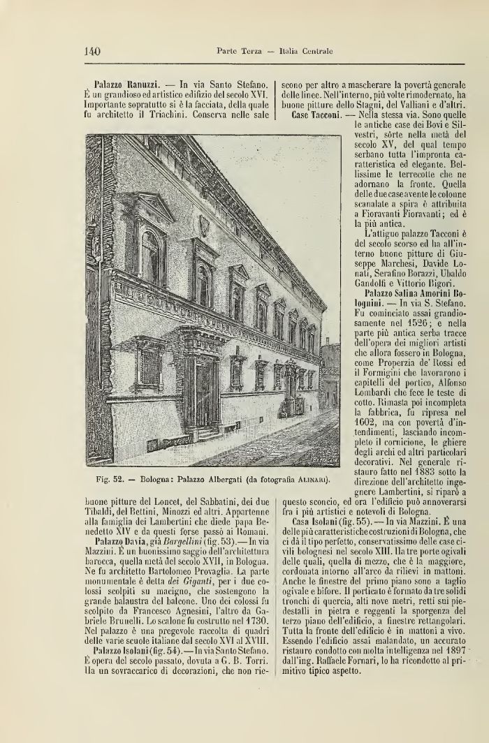 l'alaszq Davia, già Dargellini (fig. 53).— In via Mazzini. E un buonissimo saggio dell'architettura barocca, quella metà del secolo XVII, in Bologna. Ne fu architetto Bartolomeo Provaglia. La parte monumentale è detta dei Giganti, per i due colossi scolpiti su macigno, che sostengono la grande balaustra del balcone. Uno dei colossi fu scolpilo da Francesco Agnesini, l'altro da Gabriele Brunelli. Lo scalone fu costrutto nel 1730. Nel palazzo è una pregevole raccolta di quadri delle varie scuole italiane dal secolo XVI al XVIII.