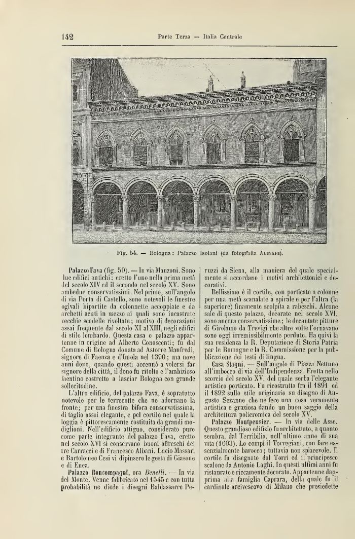Palazzo Fava (fig. 50). — In via Manzoni. Sono Ine edilìei antichi : eretto l'uno nella prima metà lei secolo XIV ed il secondo nel secolo XV. Sono ambedue conservatissimi. Nel primo, sull'angolo ili via Porta di Castello, sono notevoli le finestre ogivali bipartite da colonnette accoppiate e da archetti acuii in mezzo ai quali sono incastrate vecchie scodelle rivoltate; motivo di decorazioni assai frequente dal secolo XI alXIII, negli edifizi di stile lombardo. Questa casa o palazzo appartenne in origine ad Alberto Conoscenti; fu dal Comune di Bologna donata ad Àstorre Manfredi, signore di Faenza e d'Imola nel 1390 ; ma nove anni dopo, quando questi accennò a volersi far signore della città, il dono fu ritolto e l'ambizioso faentino costretto a lasciar Bologna con grande sollecitudine.