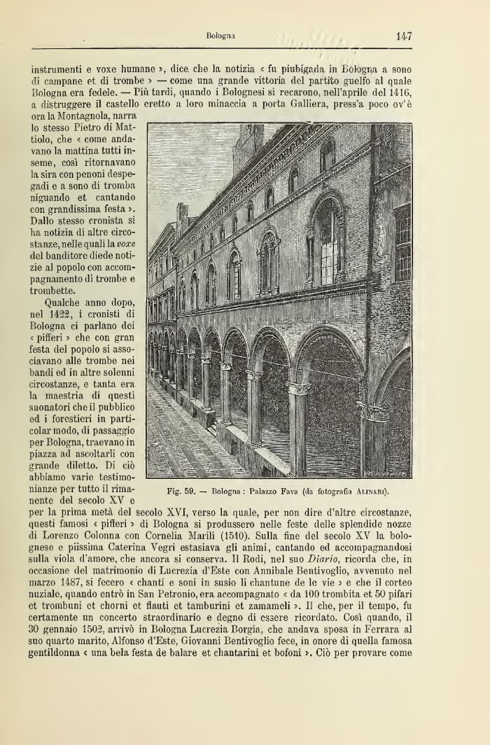 Qualche anno dopo, nel 1422, i cronisti di Bologna ci parlano dei « pifferi » che con gran festa del popolo si associavano alle trombe nei bandi ed in altre solenni circostanze, e tanta era la maestria di questi suonatori che il pubblico sci i forestieri in parti-colar modo, di passaggio per Bologna, traevano in piazza ad ascoltarli con grande diletto. Di ciò abbiamo varie testimonianze per tutto il rima- Fig. 59. - Bologna : Palazzo Fava (da fotografia Alinari) nente del secolo XV e