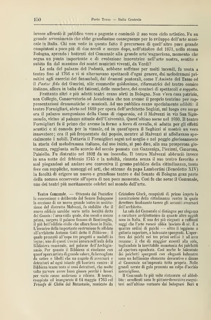Teatro Comunale. — Ottenuta dal Pontefice la concessione e deliberata dal Senato Bolognese la erezione di un nuovo grande teat.ro.in sostituzione del distrutto Malvezzi, fu stabilito che il nuovo edilizio sarebbe sorto nella località detta del Guasto : l'area sulla quale, due secoli e mezzo prima, sorgeva il palazzo famoso di Bentivoglio, il piti bell'edilizio civile che allora fosse in Italia. L'incarico della importante costruzione fu affidato all'architetto Antonio Galli detto il Bibbiena, il quale presentò all'uopo tre progetti o modelli in legno ; uno di questi trovasi ancora nell'aula della Biblioteca comunale, nel palazzo dell'Archiginnasio. Per quanto il Bibbiena si rivelasse con quest'opera artista di grande valore, fu bersagliato da satire e libelli che un nugolo di avversari e detrattori ad ogni istante gli lanciava contro : il Bibbiena tenne testa ai suoi detrattori, che molte volte parvero avere buon giuoco perchè i lavori per varie cause andavano a rilento. Fi teatro, compiuto ed inaugurato ili 4 maggio 1763 co! Trionfo dì Clelia del Metastasio, musicato da
