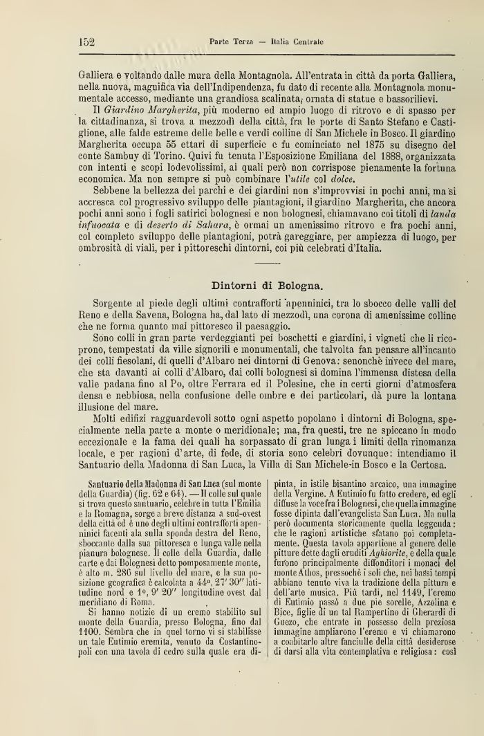 Santuario della Madonna di San Luca (sul monte della Guardia) (lìg. 62 e 64). —Il colle sul quale si trova questo santuario, celebre m tutta l'Emilia e la Romagna, sorge a breve distanza a sud-ovest della città ed è uno degli ultimi contrafforti apenninici facenti ala sulla sponda destra del Reno, sboccante dalla sua pittoresca e lunga valle nella pianura bolognese. 11 colle della Guardia, dalle carte e dai Bolognesi detto pomposamente monte, è alto m. 286 sul livello del mare, e la sua posizione geografica è calcolata a 44°, 27' 30 latitudine nord e 1°, 9' 20 longitudine ovest dal meridiano di Roma.