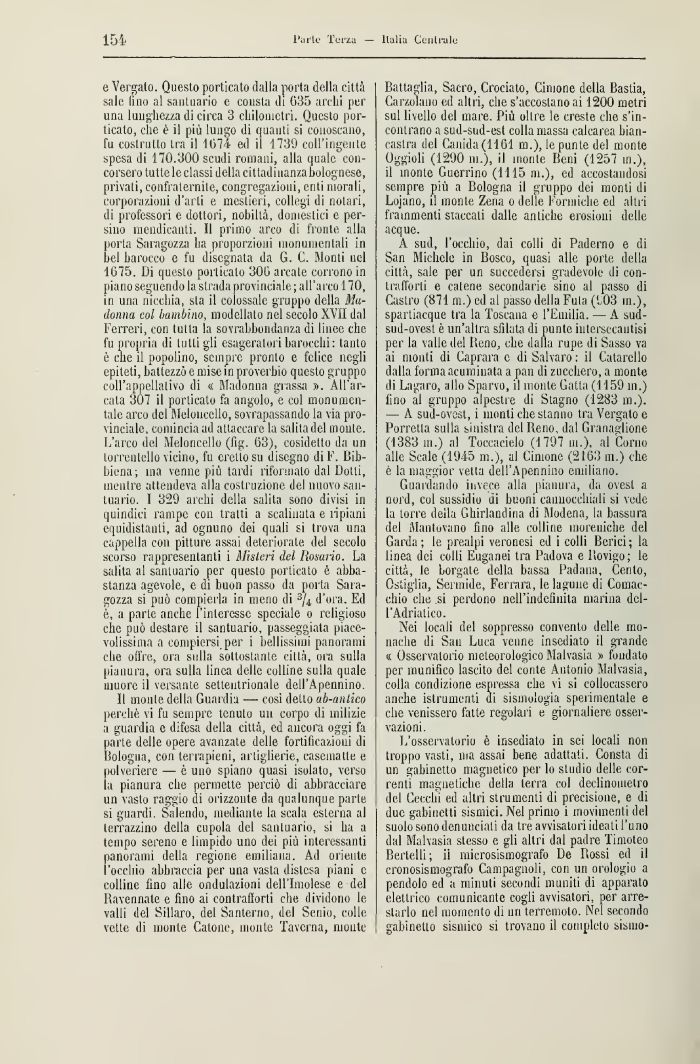 e Vergalo. Questo porticato dalla porla della città sale lino al santuario e consta di 635 archi per una lunghezza di circa 3 chilometri. Questo porticato, che è il più lungo di quanti si conoscano, fu costrutto tra il 167 t ed il 1739 coll'ingeiite spesa di 170.300 scudi romani, alla quale concorsero tuttele classi della cittadinanza bolognese, privali, confraternite, congregazioni, enti morali, corporazioni d'arti e mestieri, collegi di notali, di professori e dottori, nobiltà, domestici e persino mendicanti II primo arco di fronte alla porta Saragozza ha proporzioni monumentali in bel barocco e fu disegnata da G. C. Monti nel 1675. Di questo porticato 306 arcale corrono in piano seguendo la strada provinciale ; all'arco 170, in una nicchia, sta il colossale gruppo della Madonna col bumb'uio, modellalo nel secolo XVII dal Ferreri, con tuita la sovrabbondanza di linee che fu propria di tutti gli esageratori barocchi: tanto è che il popolino, sempre pronto e felice negli epiteti, battezzò e mise in proverbio questo gruppo coll'appellalivo di « Madonna grassa ». All'arcata 307 il porticato fa angolo, e col monumentale arco del Meloncello, sovrapassando la via provinciale, comincia ad attaccare la salita del inolile. L'arco del Meloncello (fig. 63), cosidetto da un torrentello vicino, fu eretto su disegno di F. Bibbiena; ma venne più tardi riformato dal lloiti, nienlre attendeva alla costruzione del nuovo santuario. I 329 archi della salita sono divisi in quindici rampe con tratti a scalinata e ripiani equidistanti, ad ognuno dei quali si trova una cappella con pitture assai deteriorate del secolo scorso rappresentanti i Misteri del Rosario. La salita ai santuario per questo porticato è abbastanza agevole, e di buon passo da porta Saragozza si può compierla in meno di % d'ora. Ed è, a parte anche l'interesse speciale o religioso che può destare il santuario, passeggiata piacevolissima a compiersi per i bellissimi panorami che olfre, ora sulla sottostante ciltà, ora sulla pianura, ora sulla linea delle colline sulla quale muore il versante settentrionale dell'Apennino.
