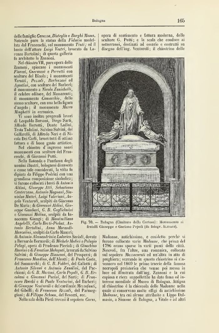 Nella Rotonda o Pantheon degli uomini illustri, bolognesi di nascita o come tale considerati, la vòlta fu dipinta da Filippo Pedrini con una grandiosa composizione simbolica; vi furono collocati i busti dì Antonio Aldini, Giuseppe Atti, Sebastiano Ganterzano, Antonio Magnani,Stanislao Mattei, Luigi Valeriani, Angelo Venturoìi, scolpiti da Giacomo De Maria; di Giovanni Aldini, Giuseppe Gambari, G. B. Gugliehnini e Giovanni Molina, scolpiti da Innocenzo Giungi ; di Massimiliano Angelelli, Carlo Berti-Piehat, Alt- FiS' 70- ~ Bologna (Cimitero della Certosa): Monumento ai Ionio Bertolini, Anna Morandi- fratelli Giuseppe e Gaetano Popoli (da fotogr. Alinaki),