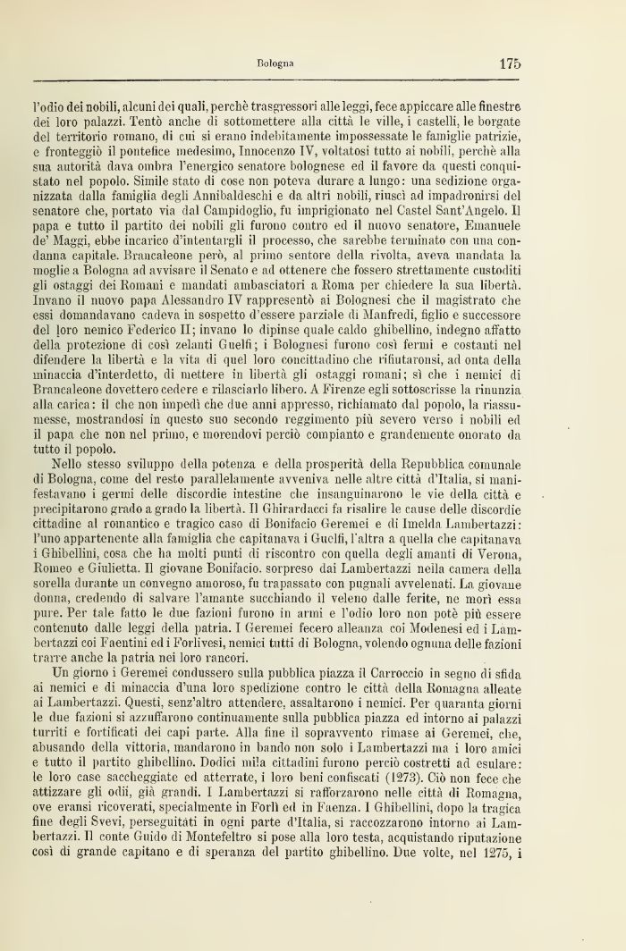 Un giorno i Geremei condussero sulla pubblica piazza il Carroccio in segno di sfida ai nemici e di minaccia d'una loro spedizione contro le città della Romagna alleate ai Lambertazzi. Questi, senz'altro attendere, assaltarono i nemici. Per quaranta giorni le due fazioni si azzuffarono continuamente sulla pubblica piazza ed intorno ai palazzi turriti e fortificati dei capi parte. Alla fine il sopravvento rimase ai Geremei, che, abusando della vittoria, mandarono in bando non solo i Lambertazzi ma i loro amici e tutto il partito ghibellino. Dodici mila cittadini furono perciò costretti ad esulare: le loro case saccheggiate ed atterrate, i loro beni confiscati (1273). Ciò 11011 fece che attizzare gli odir già grandi. I Lambertazzi si rafforzarono nelle città di Romagna, ove eransi ricoverati, specialmente in Forlì ed in Faenza. I Ghibellini, dopo la tragica fine degli Svevi, perseguitati in ogni parte d'Italia, si raccozzarono intorno ai Lambertazzi. Il conte Guido di Montefeltro si pose alla loro testa, acquistando riputazione così di grande capitano e di speranza del partito ghibellino. Due volte, nel 1275, i