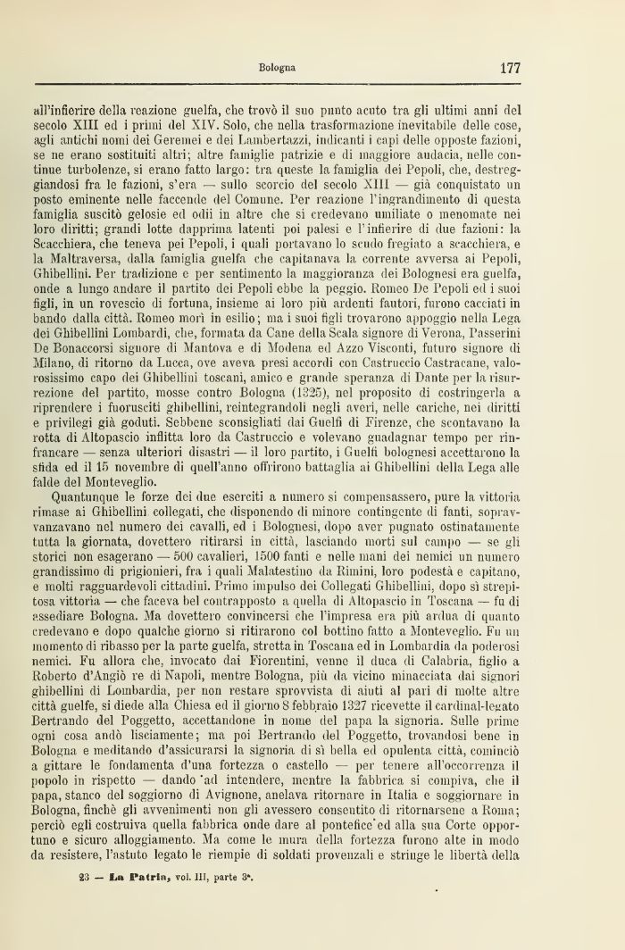 Quantunque le forze dei «lue eserciti a numero si compensassero, pure la vittoria rimase ai Ghibellini collegati, che disponendo di minore contingente di fanti, soprav-vanzavano nel numero dei cavalli, ed i Bolognesi, dopo aver pugnato ostinatamente tutta la giornata, dovettero ritirarsi in città, lasciando morti sul campo — se gli storici non esagerano — 500 cavalieri, 1500 fanti e nelle mani dei nemici un numero grandissimo di prigionieri, fra i quali Malatestino da Rimini, loro podestà e capitano, e molti ragguardevoli cittadini. Primo impulso dei Collegati Ghibellini, dopo sì strepitosa vittoria — che faceva bel contrapposto a quella di Altopascio in Toscana — fu di assediare Bologna. Ma dovettero convincersi che l'impresa era più ardua di quanto credevano e dopo qualche giorno si ritirarono col bottino fatto a Monteveglio. Fu un momento di ribasso per la parte guelfa, stretta in Toscana ed in Lombardia da poderosi nemici. Fu allora che, invocato dai Fiorentini, venne il duca di Calabria, figlio a Roberto d'Angiò re di Napoli, mentre Bologna, più da vicino minacciata dai signori ghibellini di Lombardia, per non restare sprovvista di aiuti al pari di molte altre città guelfe, si diede alla Chiesa ed il giorno 8 febbraio 1327 ricevette il cardinal-legato Bertrando del l'oggetto, accettandone in nome del papa la signoria. Sulle prime ogni cosa andò lisciamente; ma poi Bertrando del l'oggetto, trovandosi bene in Bologna e meditando d'assicurarsi la signoria di si bella ed opulenta città, cominciò a gittare le fondamenta d'una fortezza o castello — per tenere all'occorrenza il popolo in rispetto — dando ad intendere, mentre la fabbrica si compiva, che il papa, stanco del soggiorno di Avignone, anelava ritornare in Italia e soggiornare in Bologna, finché gli avvenimenti non gli avessero consentito di ritornarsene a Roma; perciò egli costruiva quella fabbrica onde dare al pontefice'ed alla sua Corte opportuno e sicuro alloggiamento. Ma come le mura della fortezza furono alte in modo da resistere, l'astuto legato le riempie di soldati provenzali e stringe le libertà della