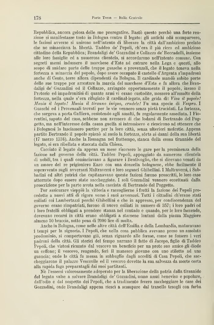 Repubblica, ancora golosa dolio sue prerogative. Bastò questo perchè una forte reazione si manifestasse tosto in Bologna contro il legato: gli antichi odii scomparvero, le fazioni avverse si unirono nell'intento di liberare la città dall'ambizioso prelato che ne minacciava la libertà. Taddeo de'Pepoli, ch'era il più ricco ed ambizioso cittadino della Repubblica; Brandaligi de' Gozzadini e Collazzo de'Beccadelli, insieme alle loro famiglie ed a numerosa clientela, si accordarono nell'intento comune. Con segreti messi indussero il marchese d'Este ad entrare nella Lega e questi, allo scopo di snidare parte delle truppe guasche e provenzali, che il legato teneva nella fortezza a minaccia del popolo, dopo avere occupato il castello d'Argenta s'impadronì anche di Cento, terre allora dipendenti da Bologna. 11 cardinale mandò subito parte delle sue truppe per arrestare la marcia del marchese d'Este e fu allora che Brandaligi de' Gozzadini ed il Collazzo, arringato opportunamente il popolo, invaso il Pretorio ed impadronitisi di quante armi vi erano custodite, mossero all'assalto della fortezza, nella quale s'era rifugiato il cardinal-legato, alle grida di: Viva il popolo! Muoia il legato! Muoia il tiranno iniquo, crudele! Fu una specie di Vespro. I Guaschi ed i Provenzali trovati per le vie vennero senza pietà trucidati. La fortezza, che sorgeva a porta Galliera, resistendo agli assalti, fu regolarmente assediata. I Fiorentini, saputo del caso, sebbene non avessero di che lodarsi di Bertrando del Pog-getto, ma nell'interesse della causa guelfa si intromisero e rissarono ad ottenere che i Bolognesi lo lasciassero partire per la loro città, senza ulteriori molestie. Appena partito Bertrando il popolo spianò al suolo la fortezza, sòrta ai danni della sua libertà (17 marzo 1334). Anche la Romagna nel frattempo, stanca della esosa tirannide del legato, si era ribellata e staccata dalla Chiesa.