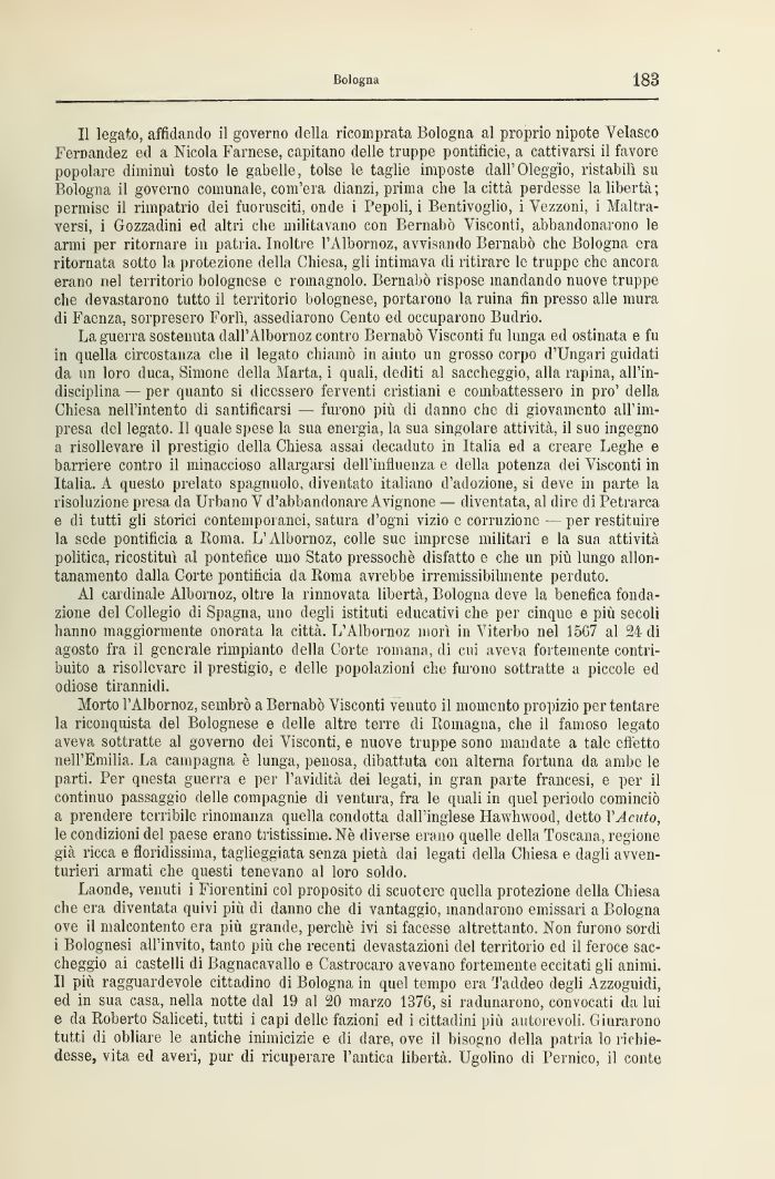 Al cardinale Albornoz, oltre la rinnovata libertà, Bologna deve la benefica fondazione del Collegio di Spagna, uno degli istituti educativi che per cinque e più secoli hanno maggiormente onorata la città. L'Albornoz morì in Viterbo nel 1507 al 24- di agosto fra il generale rimpianto della Corte romana, di cui aveva fortemente contribuito a risollevare il prestigio, e delle popolazioni che furono sottratte a piccole ed odiose tirannidi.