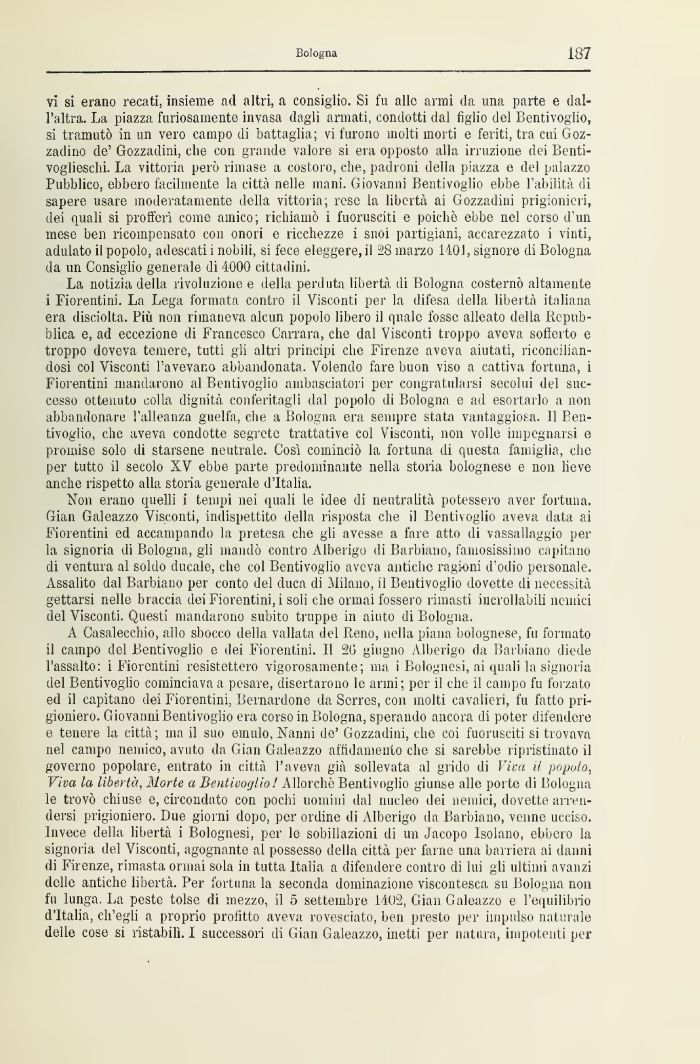 vi si erano recati, insieme ad altri, a consiglio. Si fu alle armi da una parte e dall'altra. La piazza furiosamente invasa dagli armati, condotti dal tìglio del Bentivoglio, si tramutò in un vero campo di battaglia; vi furono molti morti e feriti, tra cui Goz-zadino de' Gozzadini, che con grande valore si era opposto alla irruzione dei Benti-voglieschi. La vittoria però rimase a costoro, che, padroni della piazza e del palazzo Pubblico, ebbero facilmente la città nelle mani, Giovanni Bentivoglio ebbe l'abilità di sapere usare moderatamente della vittoria; rese la libertà ai Gozzadini prigionieri, dei (piali si proferì come amico; richiamò i fuorusciti e poiché ebbe nel corso d'un mese ben ricompensato con onori e ricchezze i snoi partigiani, accarezzato i vinti, adulato il popolo, adescati i nobili, si fece eleggere, il 28 marzo 1401, signore di Bologna da un Consiglio generale di 4000 cittadini.