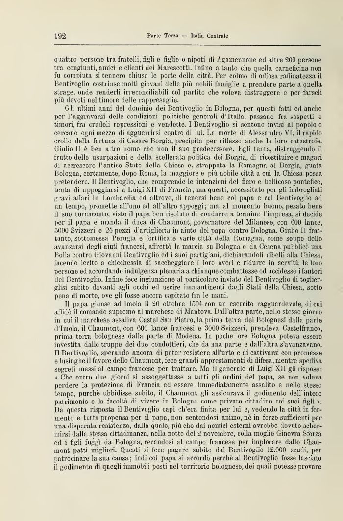 Gli ultimi anni del dominio dei Bentivoglio in Bologna, per questi fatti ed anche per l'aggravarsi delle condizioni politiche generali d'Italia, passano fra sospetti e timori, fra crudeli repressioni e vendette. 1 Bentivoglio si sentono invisi al popolo e cercano ogni mezzo di agguerrirsi contro di lui. La morte di Alessandro VI, il rapido crollo della fortuna di Cesare Borgia, precipita per riflesso anche la loro catastrofe. Giulio li è ben altro nonio clic non il suo predecessore. Egli tenta, distruggendo il frutto delle usurpazioni e della scellerata politica dei Borgia, di ricostituire e magari di accrescere l'antico Stato della Chiesa e, strappata la Romagna al Borgia, guata Bologna, certamente, dopo Roma, la maggiore e più nobile città a cui la Chiesa possa pretendere. 11 Bentivoglio, che comprende le intenzioni del fiero e bellicoso pontefice, tenta di appoggiarsi a Luigi XII di Francia; ma questi, necessitato per gli imbrogliati gravi affari in Lombardia ed altrove, di tenersi bene col papa e col Bentivoglio ad un tempo, promette all'uno ed all'altro appoggi; ma, al momento buono, pesato bene il suo tornaconto, visto il papa ben risoluto di condurre a termine l'impresa, si decide per il papa e manda il duca di Chaumont, governatore del Milanese, con C00 lance, 5000 Svizzeri e 24 pezzi d'artiglieria in aiuto del papa contro Bologna. Giulio II frattanto, sottomessa Perugia e fortificate varie città della Romagna, coinè seppe dello avanzarsi degli aiuti francesi, affrettò la marcia su Bologna e da Cesena pubblicò una Bolla contro Giovanni Bentivoglio ed i suoi partigiani, dichiarandoli ribelli alla Chiesa, facendo lecito a chicchessia di saccheggiare i loro averi e ridurre in servitù le loro persone ed accordando indulgenza plenaria a chiunque combattesse od uccidesse i fautori del Bentivoglio. Infine fece ingiunzione al particolare inviato del Bentivoglio di toglier-glisi subito davanti agli occhi ed uscire immantinenti dagli Stati della Chiesa, sotto pena di morte, ove gli fosse ancora capitato fra le mani
