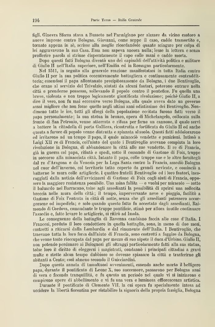 Nel 1511, in seguito alla generale reazione manifestatasi in tutta Italia contro Giulio II per la sua politica eccessivamente battagliera e continuamente contraddittoria; essendosi il papa allontanato precipitosamente da Bologna, i due Bentivoglio, die erano al servizio del Trivulzio, aiutati da alcuni fautori, poterono entrare nella città e prenderne possesso, sollevando il popolo contro il pontefice. Fu quella una breve, violenta e 11011 troppo logicamente giustificata rivoluzione; poiché Giulio IT, a dire il vero, non fu mai eccessivo verso Bologna, alla quale aveva dato un governo assai migliore che non fosse quello negli ultimi anni odiatissinio dei Bentivoglio. Nondimeno tutte le ire, tutti gli sfregi della popolazione eccitata furono fatti verso il papa personalmente; la sua statua in bronzo, opera di Michelangelo, collocata sulla fronte di San Petronio, venne atterrata e rifusa per farne un cannone, il quale servì a battere la cittadella di porla Galliera, ricostrutta e fortificata da Giulio II ed anche questa a furore di popolo venne distrutta e spianata al suolo. Questi fatti addolorarono ed irritarono ad un tèmpo il papa, il quale minacciò vendette e punizioni. Intimò a Luigi XII re di Francia, coll'aiuto del quale i Bentivoglio avevano compiuta la loro rivoluzione ili Bologna, di abbandonare la città alle sue vendette. Il re di Francia, già in guerra col papa, rifiutò e spedì, sotto il comando di Gastone di Foix, truppe in soccorso alla minacciata città. Intanto il papa, colle truppe sue e le altre fornitegli dal re d'Aragona e da Venezia per la Lega Santa contro la Francia, assediò Bologna nel cuor dell'inverno, col territorio tutto coperto da grandi nevicate, e cominciò a batterne le mura colle artiglierie. I quattro fratelli Bentivoglio ed i loro fautori, incoraggiati dalla notizia dell'avvicinarsi di Gastone (li Foix cogli aiuti di Francia, opposero la maggiore resistenza possibile. Una mina fallita e vuoisi per miracolo — sotto il baluardo nel Barracano, tolse agli assedianti la possibilità di aprirsi una sollecita breccia nelle mura della città ; il tempo, imperversante neve e pioggia, facilitò a Gastone di Foix l'entrata in città di notte, senza che gli assedianti potessero accorgersene od impedirla; e solo quando questo fatto fu accertato dagli assedianti, Raimondo di Cordova, comandante le truppe pontificie, stimò per allora inutile continuare l'assedio e, fatte levare le artiglierie, si ritirò ad Imola.