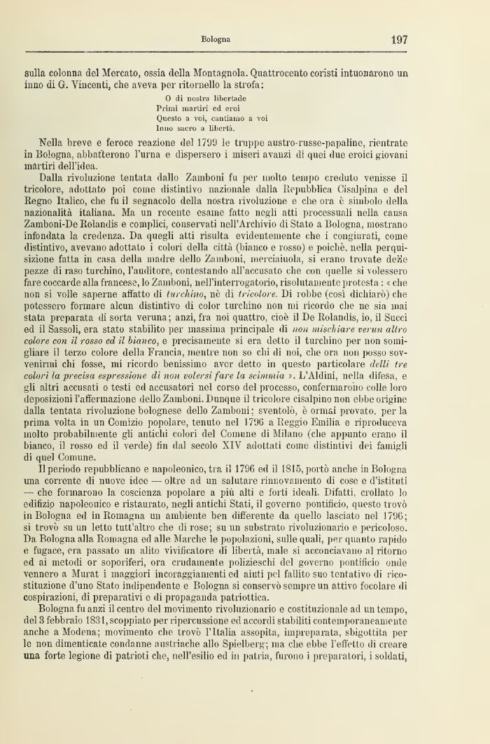 Dalla rivoluzione tentata dallo Zamboni fu per molto tempo creduto venisse il tricolore, adottato poi come distintivo nazionale dalla Repubblica Cisalpina e del Regno Italico, che fu il segnacolo della nostra rivoluzione e che ora è simbolo della nazionalità italiana. Ma un recente esame fatto negli atti processuali nella causa Zamboni-De Rolandis e complici, conservati nell'Archivio di Stato a Bologna, mostrano infondata la credenza. Da quegli atti risulta evidentemente che i congiurati, come distintivo, avevano adottato i colori della città (bianco e rosso) e poiché, nella perquisizione fatta in casa della madre dello Zamboni, merciaiuola, si erano trovate delie pezze di raso turchino, l'auditore, contestando all'accusato che con quelle si volessero fare coccarde alla francese, lo Zamboni, nell'interrogatorio, risolutamente protesta : « che non si volle saperne affatto (li turchino, nò di tricolore. Di robbe (così dichiarò) che potessero formare alcun distintivo di color turchino non mi ricordo che ne sia mai stata preparata di sorta veruna; anzi, fra noi quattro, cioè il De Rolandis, io, il Succi ed il Sassoli, era stato stabilito per massima principale di non mischiare verun altro colore con il rosso ed il bianco, e precisamente si era detto il turchino per non somigliare il terzo colore della Francia, mentre non so chi di noi, che ora non posso sovvenirmi chi fosse, mi ricordo benissimo aver detto in questo particolare delli tre colori la precisa espressione di non volersi fare la scimmia ». L'Aldini, nella difesa, e gli altri accusati o testi ed accusatori nel corso del processo, confermarono colle loro deposizioni l'affermazione dello Zamboni. Dunque il tricolore cisalpino non ebbe origine dalla tentata rivoluzione bolognese dello Zamboni: sventolò, è ormai profitto, perla prima volta in un Comizio popolare, tenuto nel 1796 a Reggio Emilia e riproduceva molto probabilmente gli antichi colori del Comune di Milano (che appunto erano il bianco, il rosso ed il verde) fin dal secolo XIV adottati come distintivi dei famigli di quel Comune.