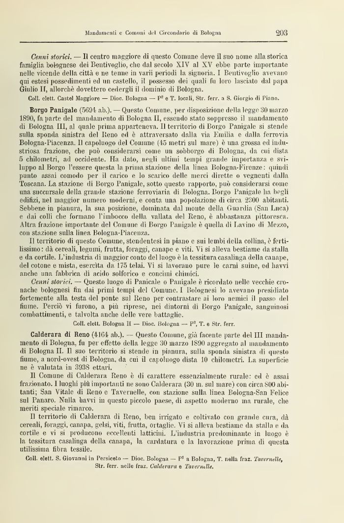 Borgo Panigale (5694 ab.). — Questo Comune, per disposizione della legge 30 marzo 1890, fa parte del mandamento di Bologna 11, essendo stato soppresso il mandamento di Bologna III, al quale prima apparteneva. Il territorio di Borgo Panigale si stende sulla sponda sinistra del Ileno ed è attraversato dalla via Emilia e dalla ferrovia Bologna-Piacenza. 11 capoluogo del Comune (45 metri sul mare) è una grossa ed industriosa frazione, che può considerarsi come un sobborgo di Bologna, da cui dista 5 chilometri, ad occidente. Ha dato, negli ultimi tempi grande importanza e sviluppo al Borgo l'essere questa la prima stazione della linea Bologna-Firenze: quindi punto assai comodo per il carico e lo scarico delle merci dirette o vegnenti dalla Toscana. La stazione di Borgo Panigale, sotto questo rapporto, può considerarsi come una succursale della grande stazione ferroviaria di Bologna. Borgo Panigale ha begli edilizi, nel maggior numero moderni, e conta una popolazione di circa 2300 abitanti. Sebbene in pianura, la sua posizione, dominata dal monte della Guardia (San Luca) e dai colli che formano l'imbocco della vallata del Reno, è abbastanza pittoresca. Altra frazione importante del Comune di Borgo Panigale è quella di Lavino di Mezzo, con stazione sulla linea Bologna-Piacenza.