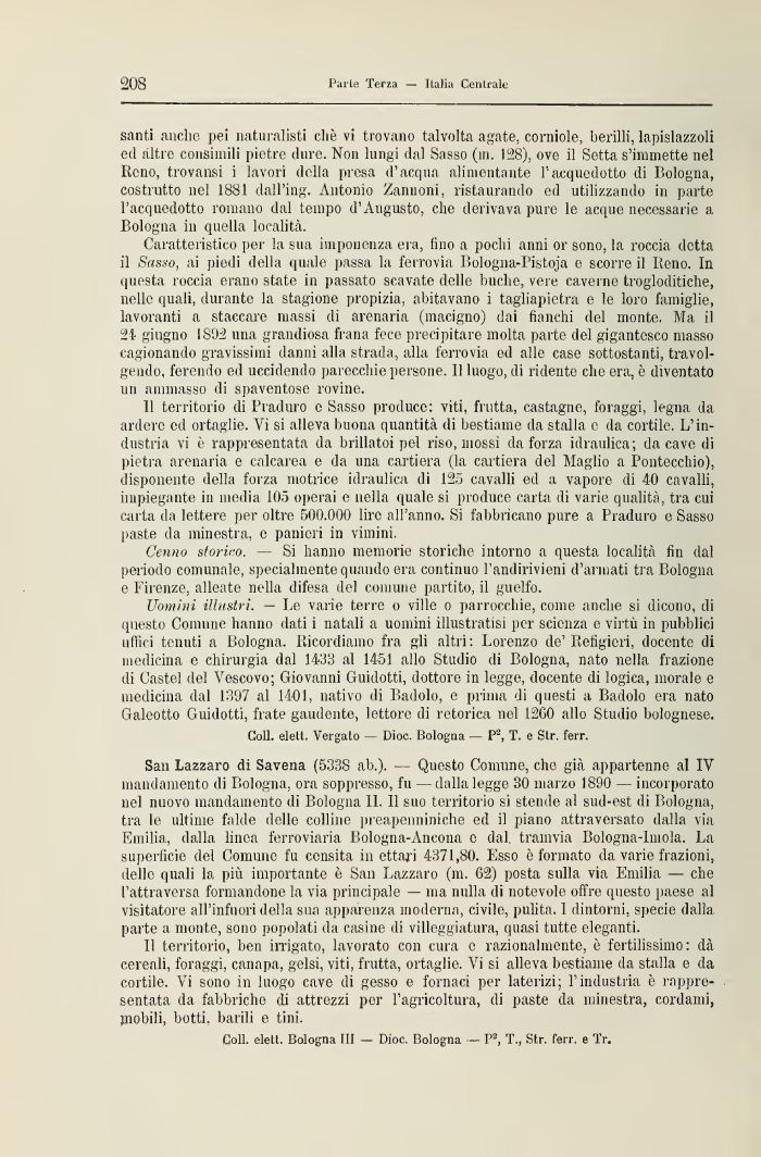 santi anche pei natura listi che vi trovano talvolta agate, corniole, berilli, lapislazzoli ed altre consimili pietre dure. Non lungi dal Sasso (in. 128), ove il Setta s'immette nel Reno, trovatisi i lavori della presa d'acqua alimentante l'acquedotto di Bologna, costrutto nel 1881 dall'ing. Antonio Zanuoni, ristaurando ed utilizzando in parte l'acquedotto romano dal tempo d'Augusto, che derivava pure le acque necessarie a Bologna in quella località.