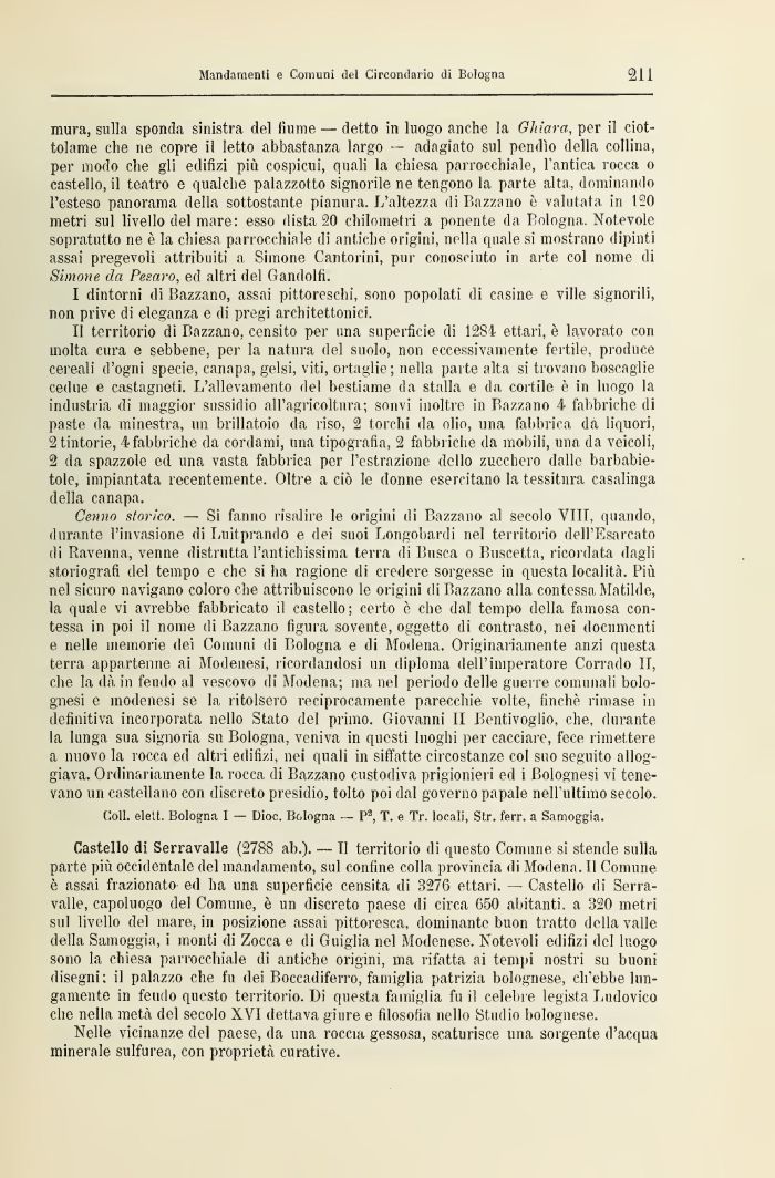 Castello di Serravalle (2788 ab.). — Il territorio di questo Comune si stende sulla parte più occidentale del mandamento, sul confine colla provincia di Modena. Il Comune è assai frazionato- ed ha una superficie censita di 3276 ettari. — Castello dì Serra-valle, capoluogo del Comune, è un discreto paese di circa 650 abitanti, a 320 metri sul livello del mare, in posizione assai pittoresca, dominante buon tratto della valle della Samoggia, i monti di Zocca e ili Guiglia nel Modenese. Notevoli edilizi del luogo sono la chiesa parrocchiale di antiche origini, ma rifatta ai tempi nostri su buoni disegni il palazzo che ftt dei Boccadiferro, famiglia patrizia bolognese, ch'ebbe lungamente in feudo questo territorio. Di questa famiglia fu il celebre legista Ludovico che nella metà del secolo XVI dettava giure e filosofia nello Studio bolognese.