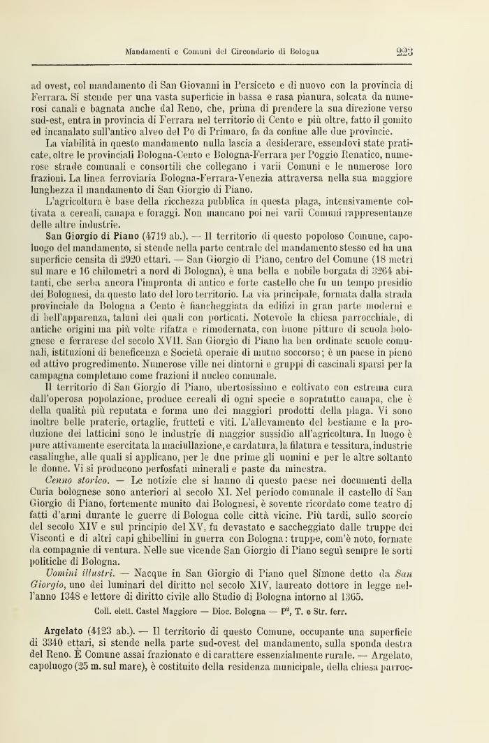 Argelato (4123 ab.). — 11 territorio di questo Comune, occupante una superficie di 3340 ettari, si stende nella parte sud-ovest del mandamento, sulla sponda destra del Reno. E Comune assai frazionato e di carattere essenzialmente rurale. — Argelato, capoluogo (25 m. sul mare), è costituito della residenza municipale, della chiesa parroc-