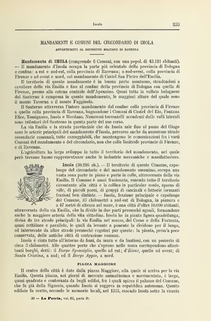 —Cj» luogo del circondario e del mandamento omonimo, occupa una vasta zona parte in piano e parte in colle, attraversata dalla via Emilia. Il Comune è assai frazionato, essendo tutto il territorio circostante alla città e la collina in particolar modo, sparso di ville, di piccoli paesi, di gruppi di cascinali e fattorie formanti frazioni ben distinte, I Imola, frazione principale e capoluogo del Comune, 33 chilometri a sud-est di Bologna, in pianura e a 47 metri di altezza sul mare, ò una città d'oltre 10.000 abitanti, attraversata dalla via Emilia, che la divide ili due parti pressoché uguali, formandone anche la maggiore arteria della vita cittadina. Imola ha in pianta figura quadrilunga, divisa da tre strade principali: la via Emilia nel mezzo, del Corso e della Fortezza, quasi rettilinee e parallele, le quali da levante a ponente la dividono per il lungo, ed intersecate da altre strade pressoché regolari pur queste : la pianta, press'a poco conservata, delle antiche città di costruzione romana.