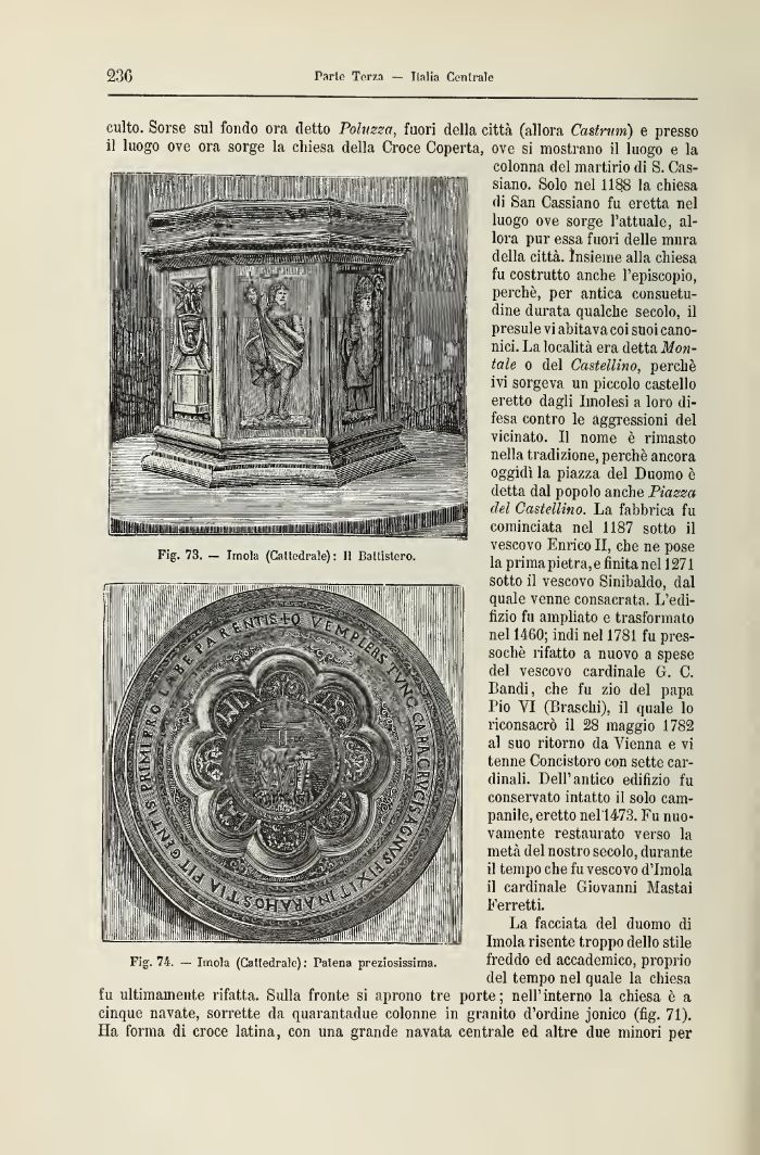 La facciata del duomo di Imola risente troppo dello stile freddo ed accademico, proprio del tempo nel quale la chiesa fu ultimamente rifatta. Sulla fronte si aprono tre porte; nell'interno la chiesa è a cinque navate, sorrette da quarantadue colonne in granito d'ordine jonico (fig. 71). Ha forma di croce latina, con una grande navata centrale ed altre due minori per