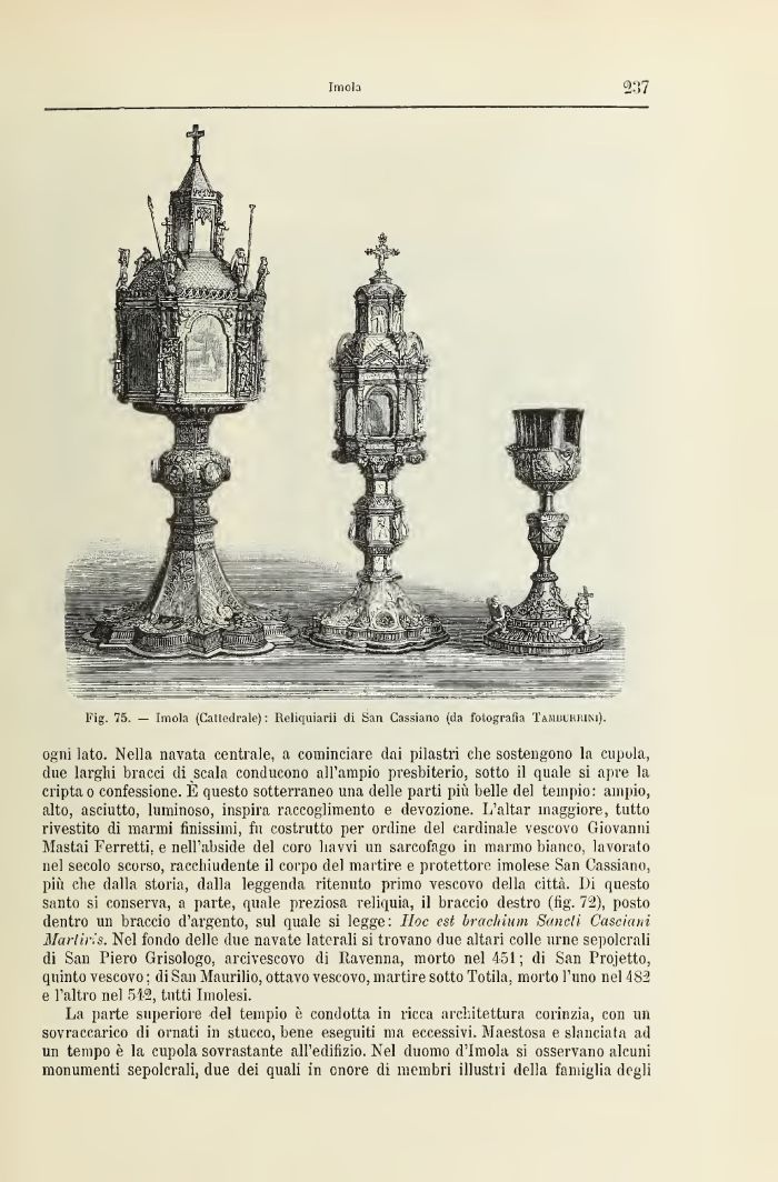 ogni lato. Nella navata centrale, a cominciare dai pilastri che sostengono la cupola, due largiti bracci di scala conducono all'ampio presbiterio, sotto il quale si apre la criptao confessione. E questo sotterraneo una delle parti più belle del tempio: ampio, alto, asciutto, luminoso, inspira raccoglimento e devozione. L'aitar maggiore, tutto rivestito di marmi finissimi, fu costrutto per ordine del cardinale vescovo Giovanni Ma stai Ferretti, e nell'abside del coro bavvi un sarcofago in marmo bianco, lavorato nel secolo scorso, racchiudente il corpo del martire e protettore imolese San Bassiano:, più che dalla storia, dalla leggenda ritenuto prono vescovo della città. Di questo Santo si conserva, a parte, quale preziosa reliquia, il braccio destro (fig. 72), posto dentro un braccio d'argento, sul quale si legge: Hoc est brachium Sancii Casciani Marliris. Nel fondo delle due navate laterali si trovano due altari colle urne sepolcrali di San Piero Grisologo, arcivescovo di Ravenna, morto nel 451; di San l'rojetto, quinto vescovo ; di San Maurilio, ottavo vescovo, martire sotto Potila, morto l'uno nel 482 e l'altro nel 512, tutti Imolesi.