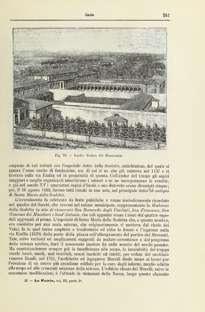 L'avvenimento fu celebrato da feste pubbliche e venne simbolicamente ricordato nel quadro del Sacchi, che trovasi nel salone municipale, rappresentante la Madonna della Scaletta in atto di ricoverare San Bernardo degli Umiliati, San Francesco, San Giacomo dei Macellari e Sant'Antonio, che tali appunto erano i nomi dei quattro ospedali aggregati al primo. L'ospedale di Santa Maria della Scaletta che, a quanto sembra, era cosidetto per una scala esterna, che originariamente vi metteva dal vicolo dei Vaiui, fu in quel turno ampliato e trasformato ed ebbe la fronte e l'ingresso sulla via Emilia (1570) dalla parte della piazza coll'allnngamento del portico dei Mercanti. Tale, salvo varianti ed ampliamenti suggeriti da mutate circostanze e dal progresso della scienza medica, durò il nosocomio imolese fin sullo scorcio del secolo passato. Ma constatandosene sempre più la insufficienza allo scopo, la insalubrità dei troppo vecchi locali, umidi, mal ventilati, orinai inadatti ed infetti, per ordine del cardinal-vescovo Bandi, nel 1781, l'architetto ed ingegnere Morelli diede mano ai lavori per l'erezione di un nuovo più grandioso edifizio per la cura degli infermi, meglio adatto allo scopo ed alle crescenti esigenze della scienza. L'edifizio ideato dal Morelli, salvo le successive modificazioni, è l'attuale in vicinanza della Rocca, luogo questo alquanto