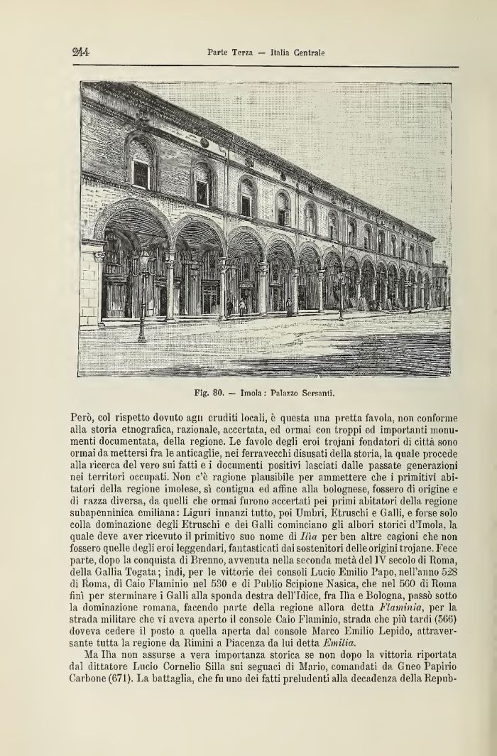 Però, col rispetto dovuto agii eruditi locali, è questa utia pretta favola, non conforme alla storia etnografica, razionale, accertata, ed ormai con troppi ed importanti monumenti documentata, della regione. Le favole degli eroi trojani fondatori di città sono ormai da mettersi fra le anticaglie, nei ferravecchi disusati della storia, la quale procede alla ricerca del vero sui fatti e i documenti positivi lasciati dalle passate generazioni nei territori occupati. Non c'è ragione plausibile per ammettere che i primitivi abitatori della regione imolese, sì contigua ed affine alla bolognese, fossero di origine e di razza diversa, da quelli che ormai furono accertati pei primi abitatori della regione subapenmnica emiliana: Liguri innanzi tutto, poi Umbri, Etruschi e Galli, e forse solo colla dominazione degli Etruschi e dei Galli cominciano gli albori storici d'Imola, la quale deve aver ricevuto il primitivo suo nome di Uìa per ben altre cagioni che non fossero quelle degli eroi leggendari, fantasticati dai sostenitori delle origini trojane. Fece parte, dopo la conquista di Bramo, avvenuta nella seconda metà del 1Y secolo di Roma, della Gallia Togata; indi, per le vittorie dei consoli Lucio Emilio Pano,nell'anno 528 di Roma, di Caio Flaminio nel 530 e di Publio Scipione Nasica, che nel 560 di Roma finì per sterminare i Galli alla sponda destra dell'Idice, fra Uìa e Bologna, passò sotto la dominazione romana, facendo parte della regione allora detta Flo,minia, per la strada militare che vi aveva aperto il console Caio Flaminio, strada che più tardi (566) doveva cedere il posto a quella aperta dal console Marco Emilio Lepido, attraversante tutta la regione da Rimini a Piacenza da lui detta Emilia.