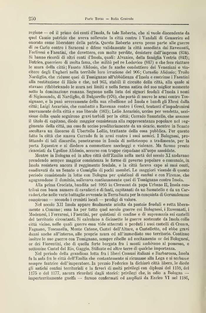 regione — ed il primo dei conti d'Imola, fu tale Roberto, che si vuole discendente da quel Cassio patrizio che aveva sollevato la città contro i Vandali di Genserico ed onorato come liberatore della patria. Questo Roberto aveva preso parte alle guerre di re Carlo contro i Saraceni e difese validamente la città assediata dai Ravennati, Forlivesi e Faentini, elio dovettero, con molte perdite, desistere dall'impresa (834). Si hanno ricordi di altri conti d'Imola, quali: Alvanico, della famiglia Vestria (842)1 ISutrico, guerriero di molta l'anta, che militò pel re Lodovico (847) e che fece riattare le mura della città; Fausto Alidosio, che fu anche condottiero dei Veneziani e vincitore degli Ungheri nella terribile loro irruzione del 906; Cornelio Alidosio; Trailo Nardiglio, che ridusse quei di Tossignano all'ubbidienza d'Imola e costrinse i Faentini alla restituzione di Riolo e che, nel 9(53, stabili il circuito della città, alla quale si stavano rifabbricando le mura nei limiti e nella forma antica del suo miglior momento sotto la dominazione romana. Seguono nella lista dei signori feudali d'Imola i nomi di Sigismondo, di Nardiglio, di Bulgarello (976), che porto di nuovo le armi contro Tossignano, e la punì severamente della sua ribellione ad Imola e bandì gli Ebrei dalla città; Luigi Accarisio, che combattè a Ravenna contro i Greci, tentanti d'impadronirsi nuovamente della città e suo litorale (983); Lelio Accarisio, ucciso per vendetta, uccisione dalla quale seguirono gravi torbidi perla città; Corrado Sassatello, che assunse il titolo di capitano, diede maggior consistenza alla rappresentanza popolare nel reggimento della città, ma esso fu ucciso proditoriamente da un sicario, mentre in Senato ascoltava un discorso di Ubertello Lollio, trattante della cosa pubblica. Ter questo fatto la città che amava Corrado fu in anni contro i suoi nemici. I Bolognesi, profittando di tali discordie, penetrarono in Imola di nottetempo a tradimento, per la porta Equestre e si diedero a commettere saccheggi e violenze. Ma furono presto ricacciati da Ugolino Alidosio, accorso con truppe cispadane all'uopo assoldate.