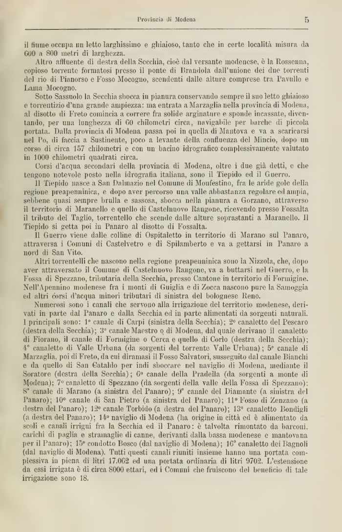 Numerosi sono i canali che servono alla irrigazione del territorio modenese, derivati in parte dal Panaro e dalla Secchia ed in parte alimentati da sorgenti naturali, I principali sono: 1° canale di Carpi (sinistra della Secchia); 2° canaletto del Pescaro (destra della Secchia); canale Maestro 0 di Modena, dal quale derivano il canaletto di Fiorano, il canale di Formigine 0 Cerca e quello di Corlo (destra della Secchia); 4° canaletto di Valle Urbana (da sorgenti del torrente Valle Urbana) ; 5° canale di Marzaglia, poi di Freto, da cui diramasi il Fosso Salvatori, susseguito dal canale Bianchi e da quello di San Cataldo per indi sboccare nel naviglio di Modena, mediante il Soratore (destra della Secchia) ; G° canale della Pradella (da sorgenti a monte di Modena); 7° canaletto di Spezzano (da sorgenti della valle della Fossa di Spezzano); 8 canale di Marano (a sinistra del Panaro); 9° canale del Diamante (a sinistra del Panaro); 10° canale di San Pietro (a sinistra del Panaro); 11° Fosso di Zenzano (a destra del Panaro); 12° canale Torbido (a destra del Panaro); 13° canaletto Bendigli (a destra del Panaro); 14° naviglio di Modena (ha origine in cittā ed č alimentato da scoli e canali irrigui fra la Secchia ed il Panaro : č talvolta rimontato da barconi, carichi di pāglia e strainaglie di canne, derivanti dalla bassa modenese e mantovana per il Panaro); 15° condotto Bosco (dal naviglio di Modena); 1G° canaletto dei Bagnoli (dal naviglio di Modena). Tutti questi canali riuniti insieme hanno una portata complessiva in piena di litri 17.0G2 ed una portata ordinaria di litri 0702. L'estensione da essi irrigata č di circa 8000 ettari, ed i Comuni che fruiscono del beneficio di tale irrigazione sono 18.