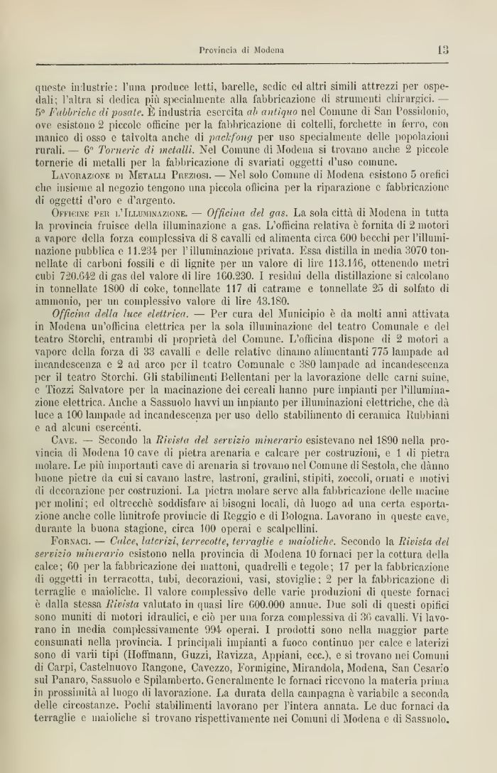 questo in lustrie : l'una produce letti, barelle, sedie ed altri simili attrezzi per ospedali, l'altra si dedica più specialmente alla fabbricazione di strumenti chirurgici.— 5° Fabbriche di posate. È industria esercita ab antiquo nel Comune di San Possidonio, ove esistono 2 piccole officine per la fabbricazione di coltelli, forchette in ferro, con manico di osso e talvolta anche di paclcfong per uso specialmente delle popolazioni Mirali. — 6 Torneric di metalli. Nel Comune di .Modena si trovano anche 2 piccole tornerie di metalli per la fabbricazione di svariati oggetti d'uso comune.