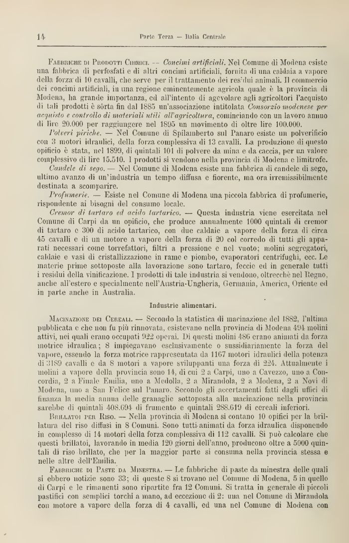 Fabbriche di Prodotti Chimici. — Concimi artificiali. Nel Comune di Modena esiste una fabbrica di perfosfati e di altri concimi artificiali, fornita di una caldaia a vapore della forza di 10 cavalli, che serve per il trattamento dei resMui animali. Il commercio dei concimi artificiali, in una regione eminentemente agricola quale è la provincia di Modena, ha grande importanza, ed all'intento di agevolare agli agricoltori l'acquisto di tali prodotti è sórta fin dal 1885 un'associazione intitolata Consorzio modenese per acquisto e controllo di materiali utili all' agricoltura, cominciando con un lavoro annuo de lire 20.000 per raggiungere nel 1895 un movimento di oltre lire 100.000.