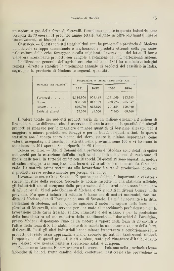 La Direzione generale dell'agricoltura, che coiranno 1891 ha cominciato indagini regolari, dirette a stabilire la produzione annuale di prodotti del caseificio in Italia, segna per la provincia di Modena le seguenti quantità: