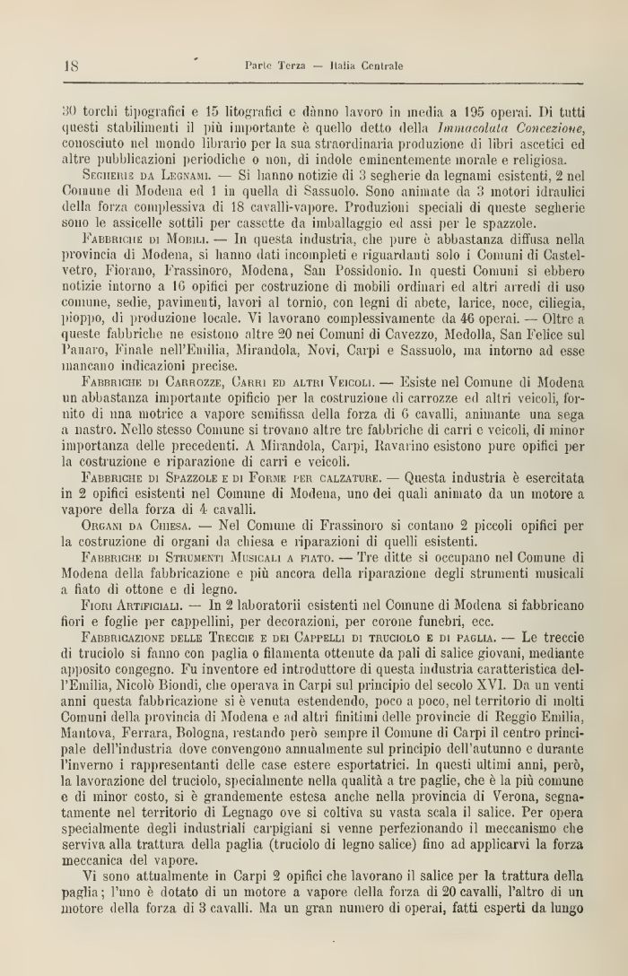 Fabbricazione delle Treccie e dei Cappelli di truciolo e di paglia. — Le treccie di truciolo si fanno con paglia o filamenta ottenute da pali di salice giovani, mediante apposito congegno. Fu inventore ed introduttore di questa industria caratteristica dell'Emilia, Nicolò Biondi, che operava in Carpi sul principio del secolo XVI. Da un venti anni questa fabbricazione si è venuta estendendo, poco a poco, nel territorio di molti Comuni della provincia di Modena e ad altri finitimi delle provincie di Reggio Emilia, Mantova, Ferrara, Bologna, restando però sempre il Comune di Carpi il centro principale dell'industria dove convengono annualmente sul principio dell'autunno e durante l'inverno i rappresentanti delle case estere esportatrici, in questi ultimi anni, però, la lavorazione del truciolo, specialmente nella qualità a tre paglie, che è la più comune e di minor costo, si è grandemente estesa anche nella provincia di Verona, segnatamente nel territorio di Legnago ove si coltiva su vasta scala il salice. Per opera specialmente degli industriali carpigiani si venne perfezionando il meccanismo che serviva alla trattura della paglia (truciolo di legno salice) fino ad applicarvi la forza meccanica del vapore.