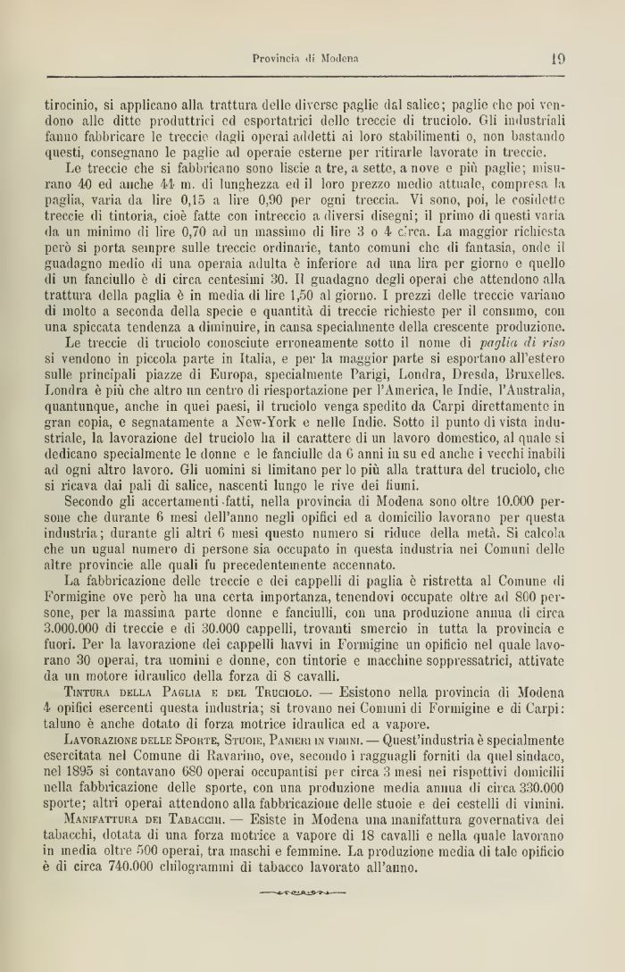Secondo gli accertamenti fatti, nella provincia di Modena sono oltre 10.000 persone che durante 6 mesi dell'anno negli opifici ed a domicilio lavorano per questa industria ; durante gli altri G mesi questo numero si riduce della metà. Si calcola che un ugual numero di persone sia occupato in questa industria nei Comuni delle altre provincie alle quali fu precedentemente accennato.