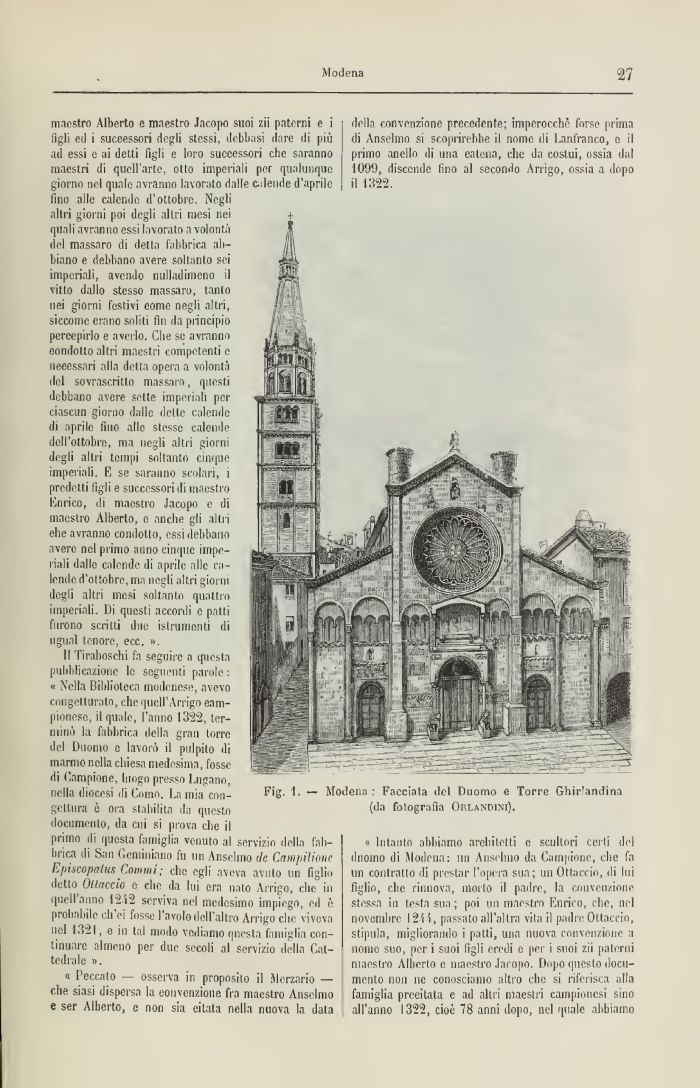 « Intanto abbiamo architetti e scultori certi del duomo di Modena: mi Anselmo da Campione, che fa un contratto di prestar l'opera sua; un Ottaccio, di lui figlio, che rinnova, morto il padre, la convenzione stessa in testa sua; poi un maestro Enrico, clic, nel novembre I2M, passato all'altra vita il padre Ottaccio, stipula, migliorando i patti, una nuova convenzione a nomo suo, per i suoi figli eredi e per i suoi zii paterni maestro Alberto e maestro Jacopo. Dopo questo documento non ne conosciamo altro che si riferisca alla famiglia precitata e ad altri maestri campioncsi sino all'anno 1322, cioè 78 anni dopo, nel quale abbiamo