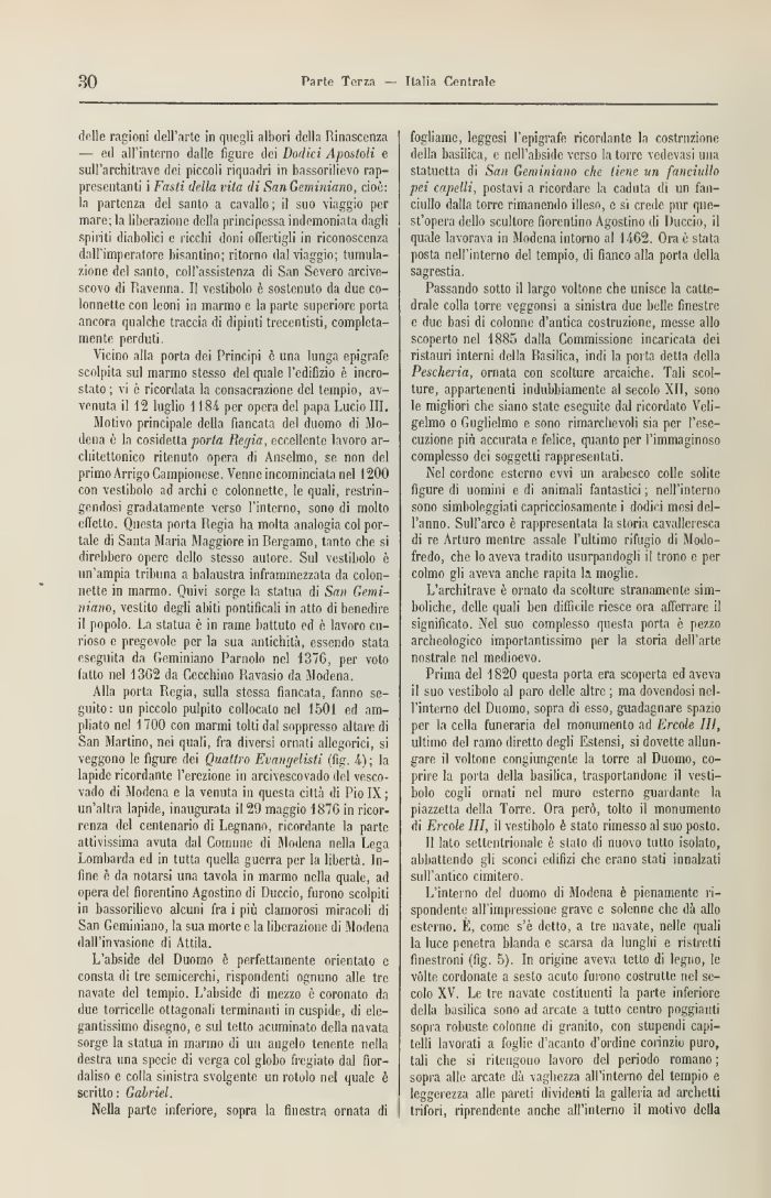 Alla porta Regia, sulla stessa fiancata, fanno seguito: un piccolo pulpito collocato nel 1501 ed ampliato nel 1700 con marmi tolti dal soppresso altare di San Martino, nei quali, fra diversi ornati allegorici, si veggono le figure dei Quattro Evanr/elisti (fig. A) ; la lapide ricordante l'erezione in arcivescovado del vescovado di Modena e la venuta in questa città di Pio IX ; un'altra lapide, inaugurata il 29 maggio I87G in ricorrenza del centenario di Legnano, ricordante la parte attivissima avuta dal Comune di Modena nella Lega Lombarda ed in tutta quella guerra per la libertà. Infine è da notarsi una tavola in marmo nella quale, ad opera del fiorentino Agostino di Duccio, furono scolpiti in bassorilievo alcuni fra i più clamorosi miracoli di San Geminiano, la sua morte e la liberazione di Modena dall'invasione di Attila.