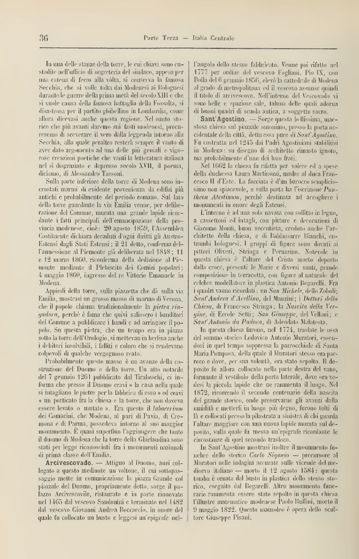 In una delle stanze della torre, le cui cliiau sono cu-Studite Ml'uOMo di segreteria «lei sindaco, appesa per lina catena di ferro alla vòlta, si conserva la famosa Secchia, clic si filile tolta dai Modenesi ai Bolognesi duraci.-.le guerre della prima metà del secolo XIII e clic si vuole causa della famosa battaglili della Fossalta, si disastrosa per il parlilo ghibellino ni Lombardia, come dio!» (Ikevasi nuche questa regione. Nel siinlo storico che pili avanti daremo sui fasti modenesi, procureremo di sceverare il vero dalla leggenda intorno alla Secchia, alla quale peraltro resterà sempre il vaulo di ave: dato argomento ad una delle più geniali e vigorose creazioni poetiche clic vanti la letteratura italiana nel fi disgraziato e depresso secolo XVII, il poema, diciamo, di Alessandro Tassoni.