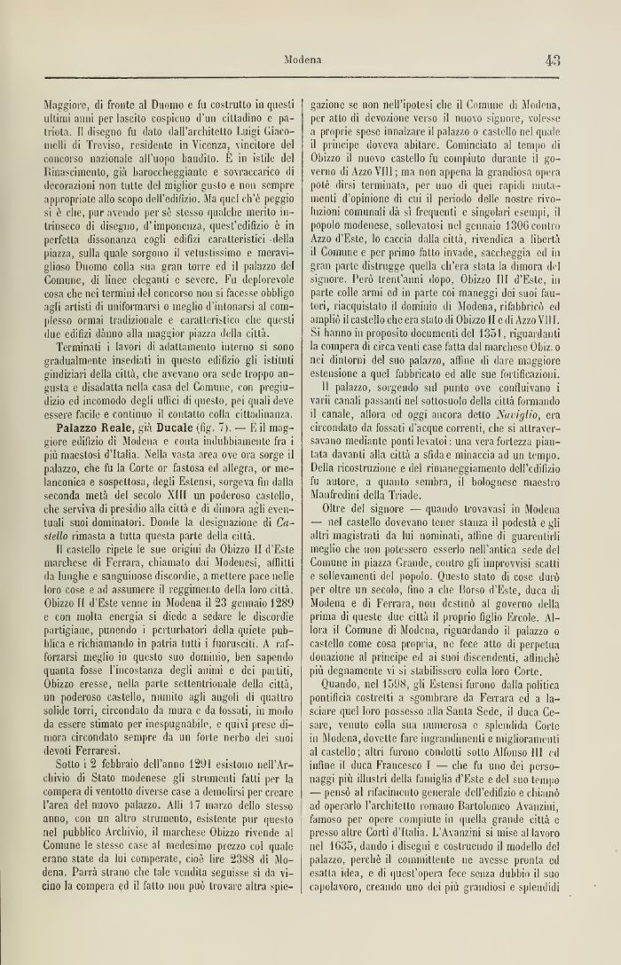 Palazzo Reale, già Ducale (fig. 7), — E il maggiore edilìzio di Modena e conta indubbiamente fra i pin maestosi d Italia. Nella vasta area ove ora sorge il palazzo, che fu la Corte or fastosa ed allegra, or melanconica e sospettosa, degli Estensi, sorgeva fin dalla seconda metà del secolo XIII un poderoso castello, che serviva di presidio alla città e di dimora agli eventuali suoi dominatori Donde la designazione di Castello rimasta a tutta questa parte della città.