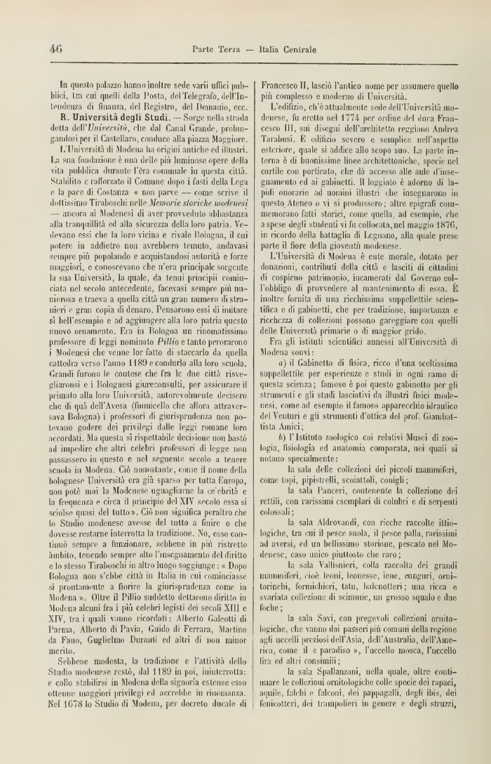 L'edifizio, cli'ò attualmente sede dell'Università modenese, fu eretto nel 1774 per ordine del dura Francesco III, sui disegni dell'architetto reggiano Andrea Tarabusi. Ii edilìzio severo e semplice nell'aspetto esteriore, quale si addice allo scopo suo. La parte interna ò ili buonissime linee architettoniche, specie nel cortile con porticato, clic dà accesso alle aule d'insegnamento ed ai gabinetti. Il loggiato è adorno di lapidi onorarie ad uomini illustri clic insegnarono in questo Ateneo o vi si produssero; altre epigrafi commemorano fatti storici, come quella, ad esempio, che a spese degli studenti vi fu collocata, nel maggio 187(5, in ricordo della battaglia di Legnano, alla quale [irose parte il fiore della gioventù modenese.