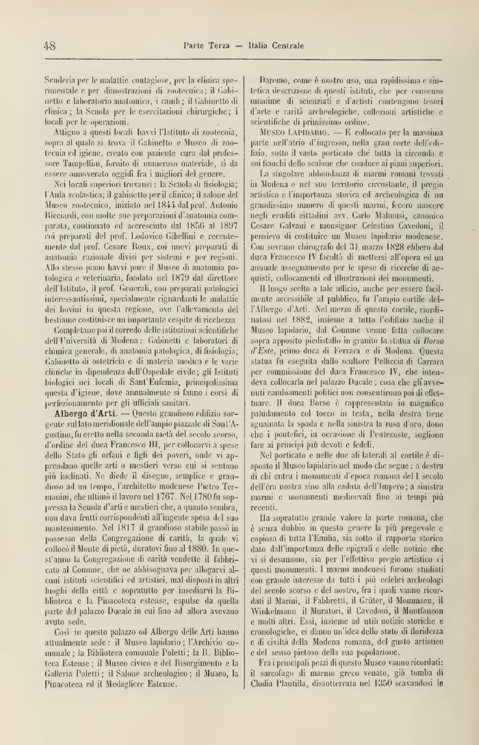 Completano poi il corredo delle istituzioni scientifiche dell Università ili Modena : Gabinetti e laboratori di chimica generale, di anatomia patologica, di fisiologia; Gabinetto di ostetricia e di materia medica e le varie cliniche in dipendenza dell'Ospedale civile; gli Istituti biologici nei locali ili Sant'Eufemia, prineipalissiina questa d'igiene, dove annualmente si lamio i corsi di perfezionamento per gli ufficiali sanitari.