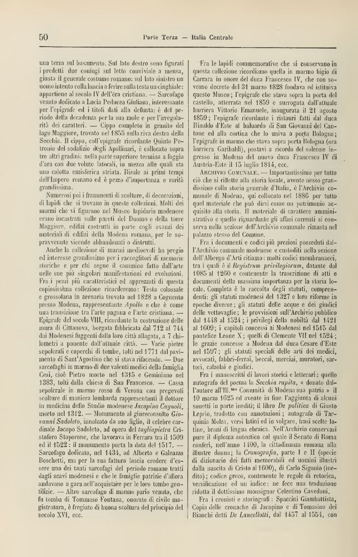 ima terza sul basamento. Sul lato destro sono figurali i predetti due coniugi sul letto conviviale a mensa, giusta il generale costume romano: sul lato sinistro un uomo intento colla lancia a ferire sulla testa un cinghiale: appartiene al secolo IV dell'era cristiana. — Sarcofago venato dedicato a Lucia Peducea Giuliana, interessante per l'epigrafe ed i titoli dati alla defunta: è del periodo della decadenza perla sua mole e per l'irregolarità dei caratteri. — Cippo completo in granito del lago Maggiore, trovato nel 1855 sulla riva destra della Secchia. Il cippo, coll'epigrafe ricordante Quinto Petronio del sodalizio itegli Apollinari, è collocato sopra tre altri gradini: nella parte superiore termina a foggia d'ara con due volute laterali, in mezzo alle quali sta una calotta emisferica striata. Iìisale ai primi tempi dell'Impero romano ed è pezzo d'importanza e rarità grandissima.