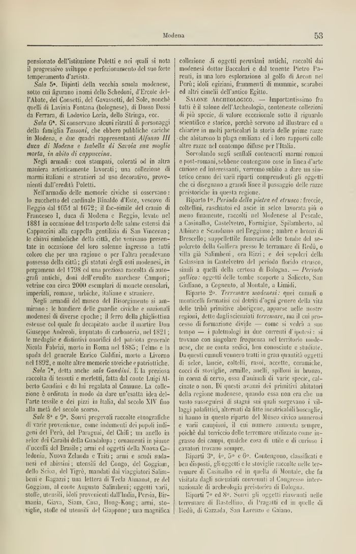 Riparto 1°. Periodo della pietra ed etrusco : treccie, coltellini, raschiatoi ed ascio in selce lavorata più o meno (inamente, raccolti nel Modenese al Pescale, a Casinalbo, Castelvetro, Formigine, Spilamberto, ad Albinea e Scandiano nel Reggiano ; ambre e bronzi di Brescello; suppclletlile funeraria delle tombe del sepolcreto della Golliera presso le terramare di Rcdù, o villa già Salimbeni, ora Rizzi ; e dei sepolcri della Galassina in Castelvetro del periodo florido etrusco, simili a quelli della certosa di Bologna. — Periodo rjallico: oggetti delle tombe scoperte a Saliceto, San Giuliano, a Cogliente, al Montale, a Limidi.