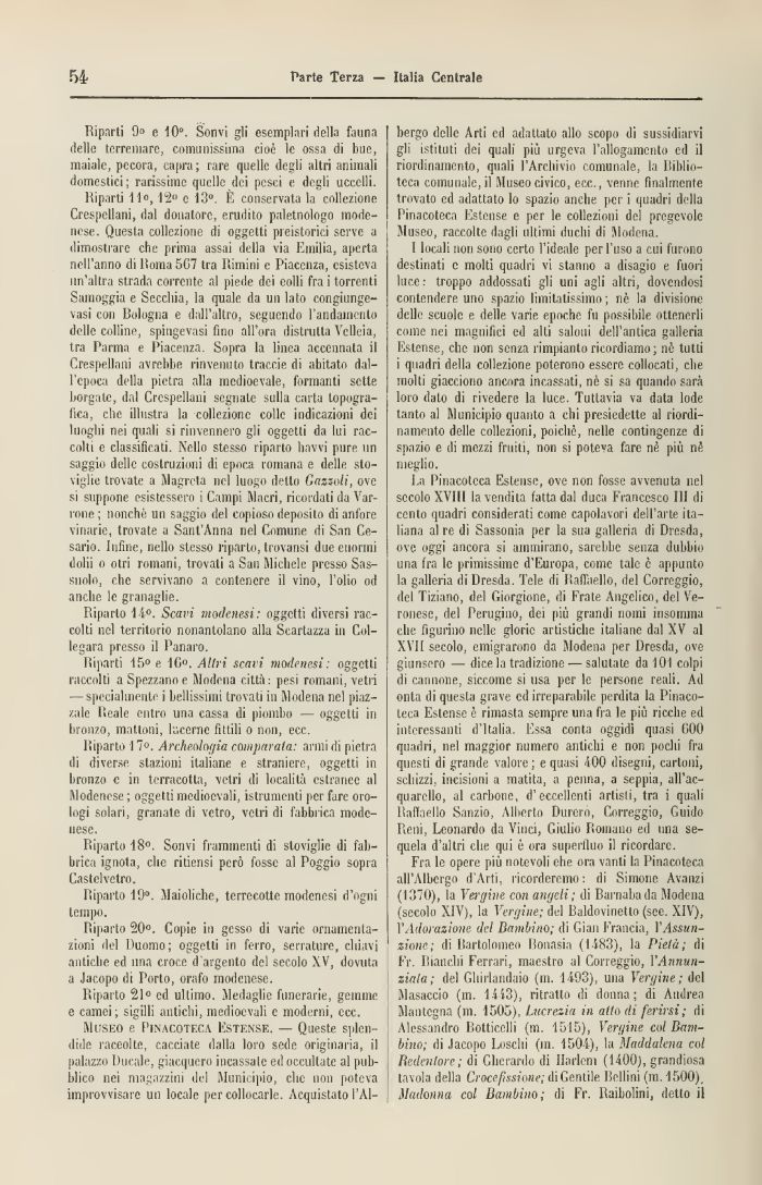 Riparti 11, 12° e 13°. È conservata la collezione Crespellani, dal donatore, erudito paletnologo modenese. Questa collezione di oggetti preistorici serve a dimostrare che prima assai della via Emilia, aperta nell'anno di Roma 5G7 tra Rimini e Piacenza, esisteva un'altra strada corrente al piede dei eolli fra i torrenti Samoggia e Secchia, la quale da un lato conginnge-vasi con Bologna e dall'altro, seguendo 1 andamento delle colline, spingevasi fino all'ora distrutta Velleia, tra Parma e Piacenza. Sopra la linea accennata il Crespellani avrebbe rinvenuto traccie di abitato dall'epoca della pietra alla medioevale, formanti sette borgate, dal Crespellani segnate sulla carta topografica, che illustra la collezione colle indicazioni dei luoghi nei quali si rinvennero gli oggetti da lui raccolti e classificati. Nello stesso riparto havvi pure un saggio delle costruzioni di epoca romana e delle stoviglie trovate a Magrcta nel luogo detto Gazz-oli, ove si suppone esistessero ì Campi Meri, ricordati da Var-rone ; nonché un saggio del copioso deposito di anfore vinarie, trovate a Sant'Anna nel Comune di San Cesario. Infine, nello stesso riparto, trovansi due enormi dulii o otri romani, trovati a San Michele presso Sassuolo, clic servivano a contenere il vino, l'olio od anche le granaglie.